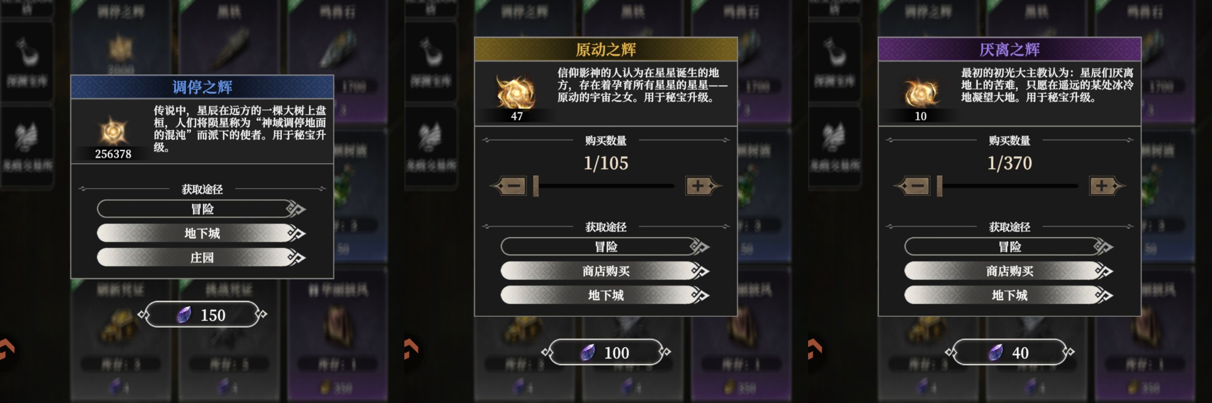 ③厌离之辉、蜀天之辉、原动之辉:这三个都是升级秘宝的高级材料,当下需要的话一样都是可以兑换的。