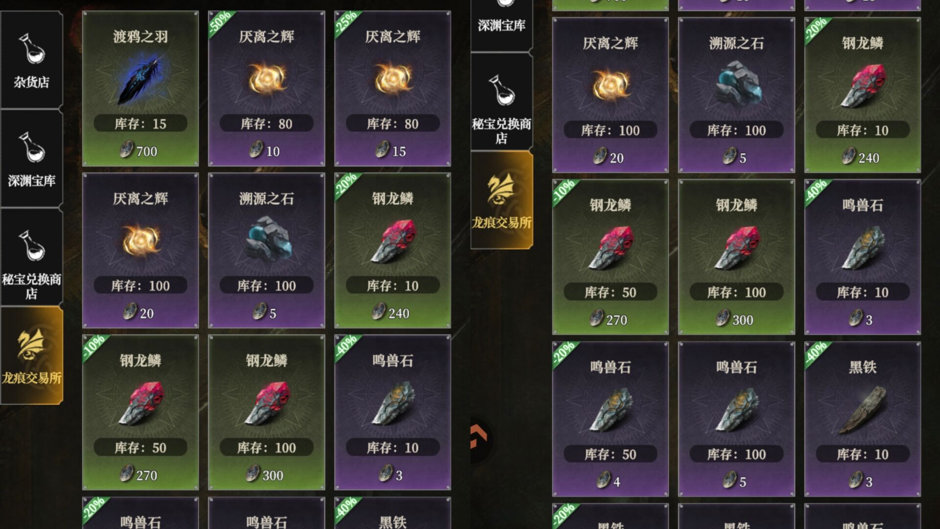 1:优先兑换:渡鸦之羽、打折的钢龙鳞、打折的厌离之辉、蜀天之辉、原动之辉。