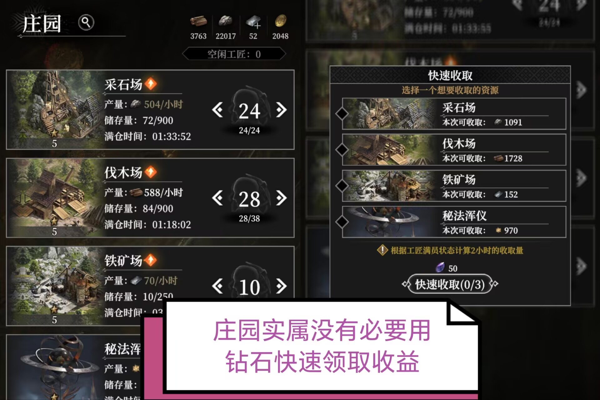4:第四点【庄园】建议用宝石快速收益资源吗?答:非常不建议。