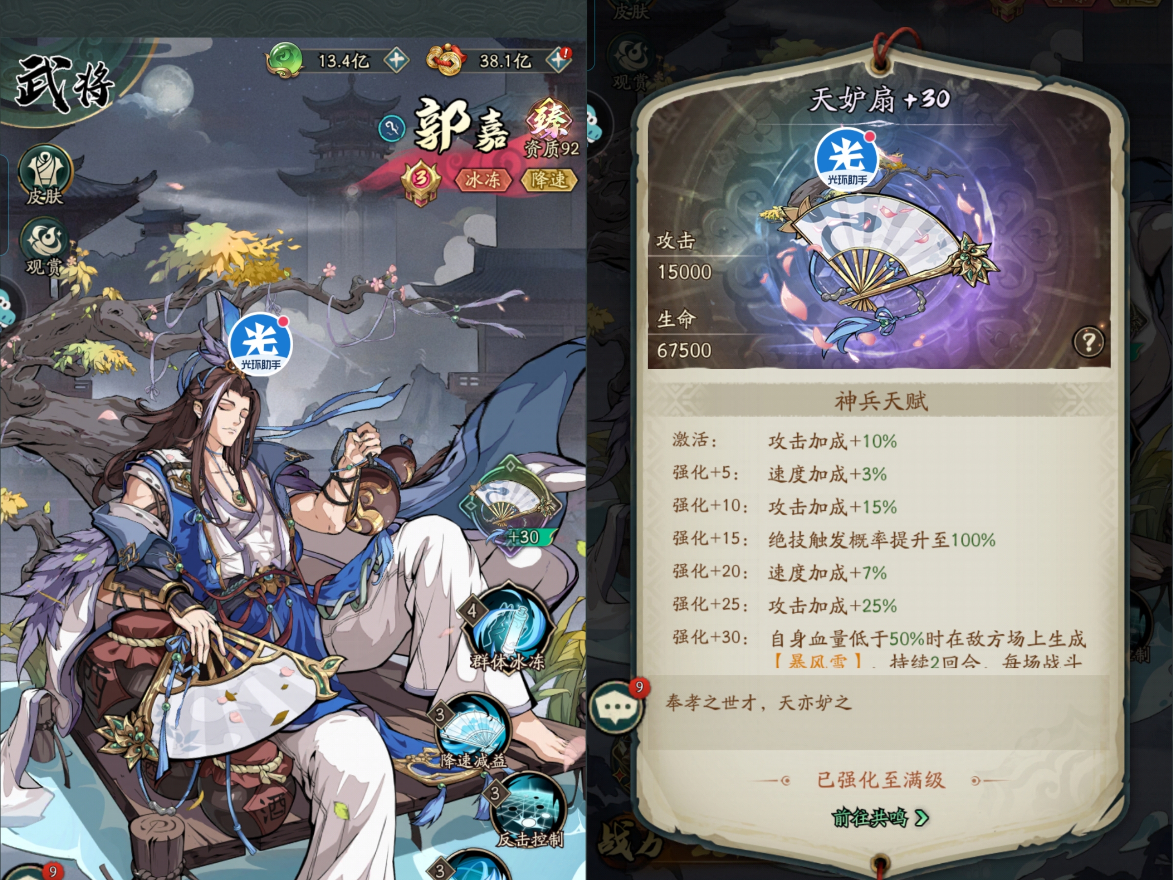 解析:郭嘉前期力推培养的武将,开局可以降低敌人的速度和伤害减免,这点含金量就很高了而且大招带冰冻控制和寒霜增伤,受到攻击还可以适当怒气进行反击,极大削弱敌人的作战能力。