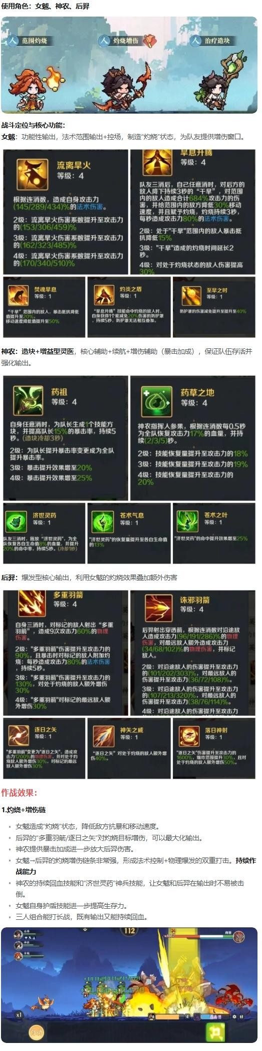 【萌新攻略】人族养成角色推荐&阵容推荐光环小G发布于 2025-10-16关注阵容推荐-灼烧暴击流 2.控场与清理能力女魃降低敌人移动速度和暴击抵抗,可减缓敌方推进和减轻输出压力。后羿连环物理伤害+标记机制可快速消灭关键目标。控场+爆发,面对群怪和BOSS都有不错的表现。3.需要注意:女魃和后羿的技能依赖连消和灼烧触发,消除链条不畅时输出可能下降,此时手动操作英雄技能可能可以打出更高的伤害哦。神农作为辅助,需要持续消除技能方块保证队伍增益稳定。无需吝啬点击神农的“落单”方块哦~