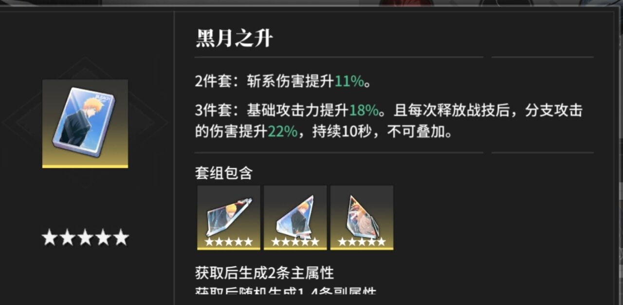 解析:两件套可以提升斩系伤害,3件套提升基础攻击力,同时强化分支攻击的伤害是一护的首选。