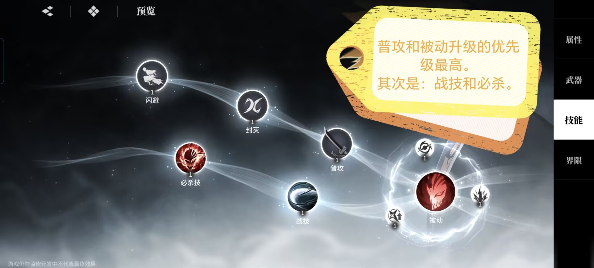 三:【黑崎一护卍解】技能升级顺序推荐。普攻>被动>战技>必杀技>封灭>闪避。