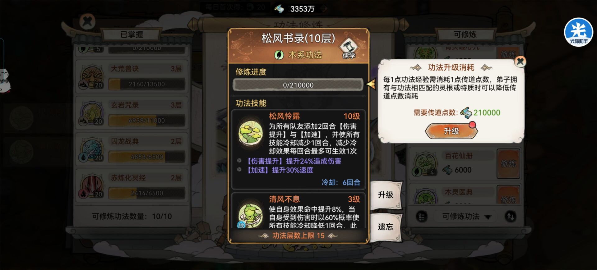 ②第二种增伤思路就是:带增伤功法给队友增伤,适合命中不高的阿璃最常见的增伤功法就是:《松风书录》