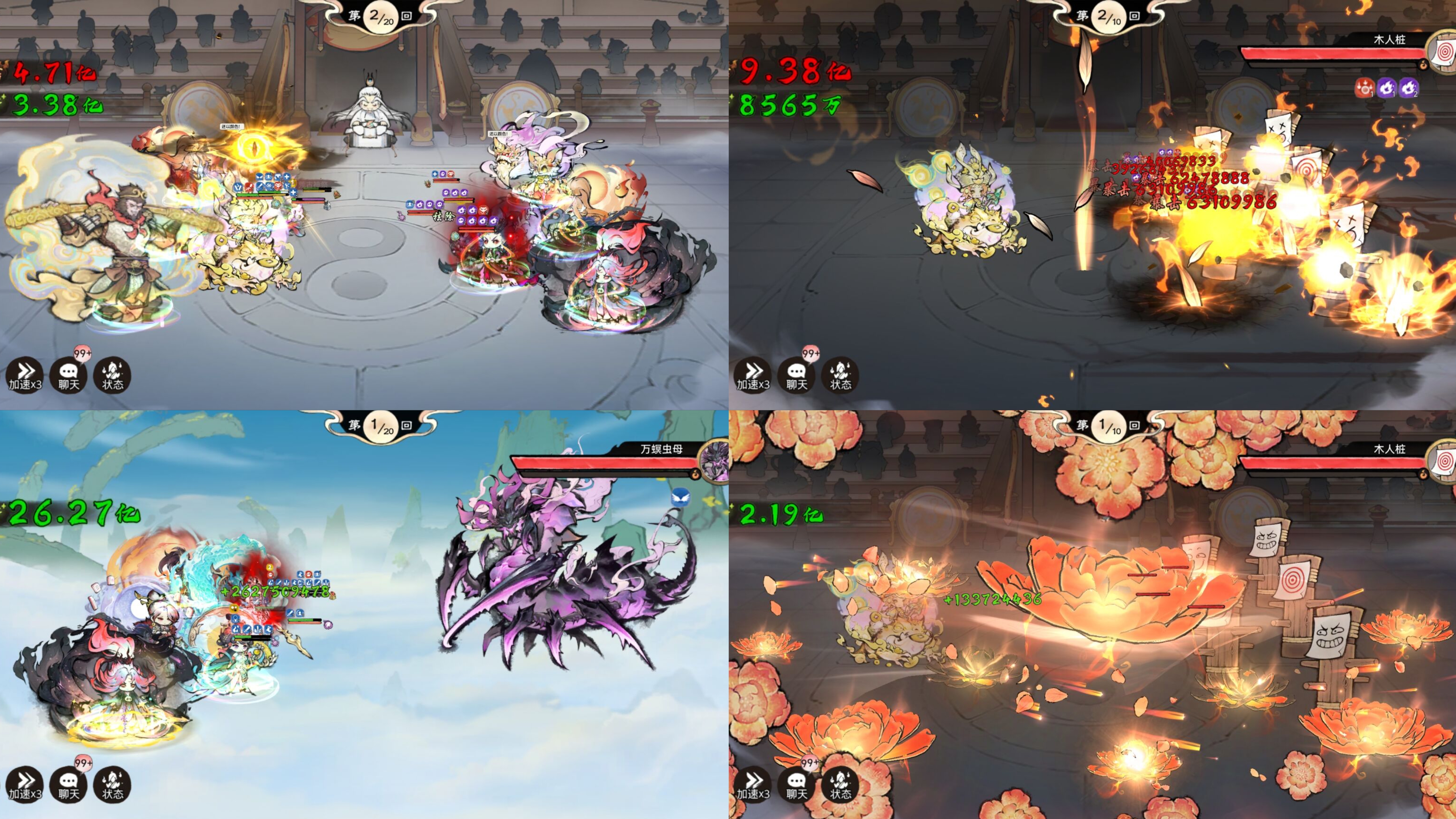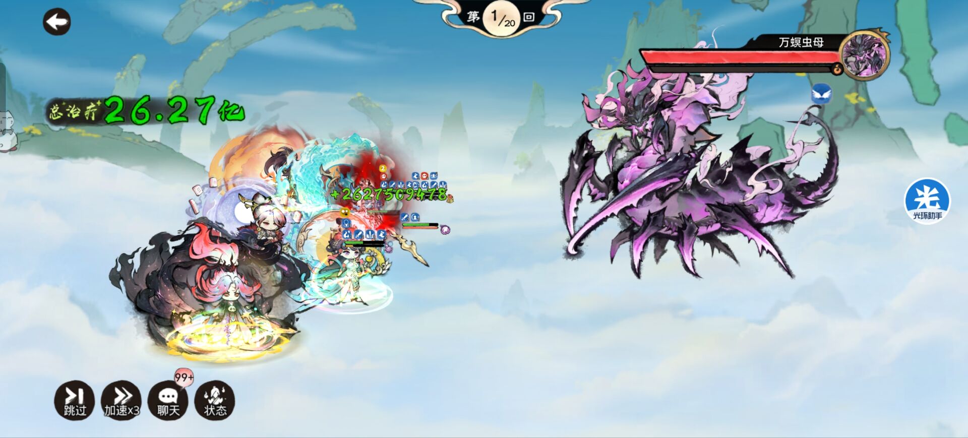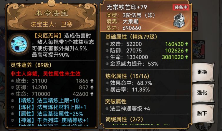 我方c位卫寒 凤里牺 至尊宝 女刀通过带本命法宝:无常印,实现增伤最大化。