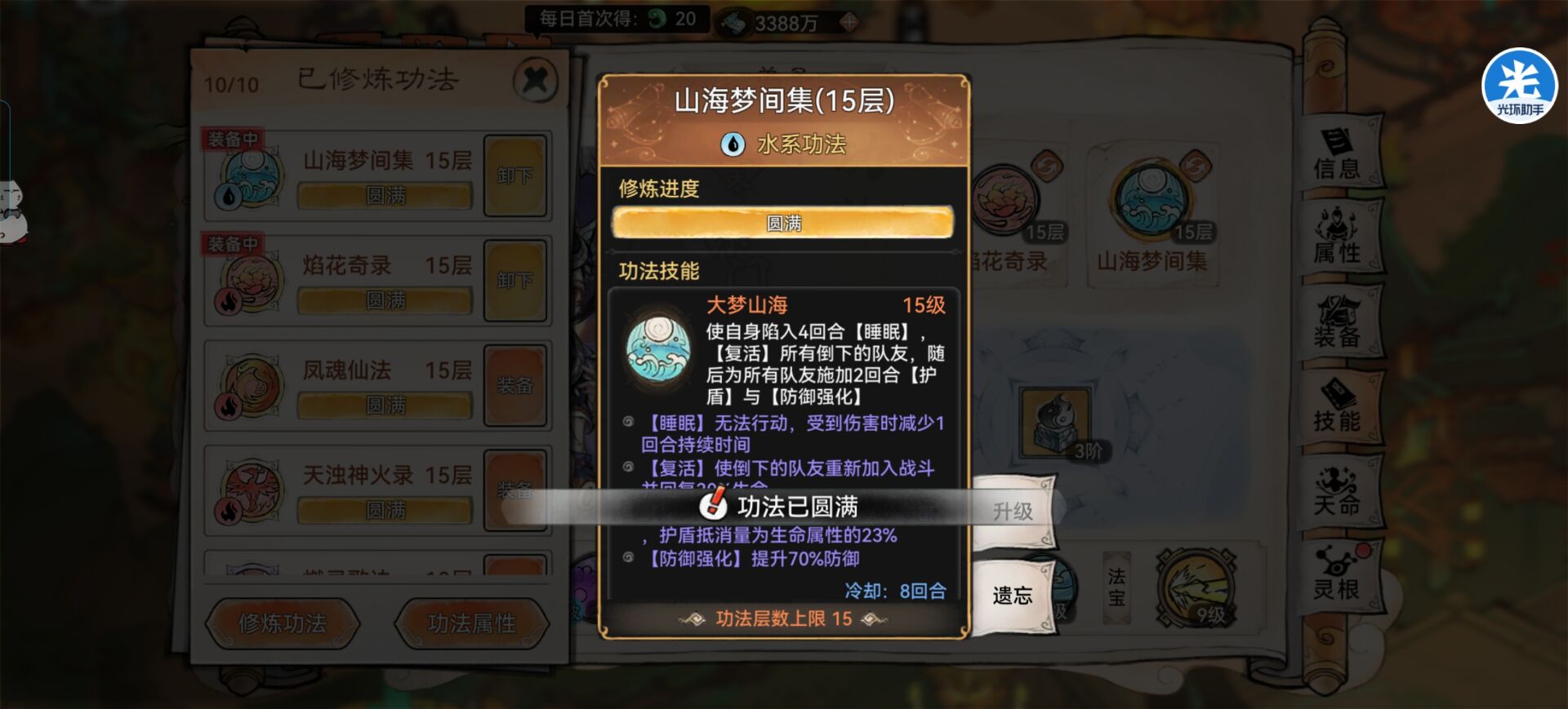 那么阿璃就可以带复活功法:山海、凤魂来作为一个复活工具人,来复活队友,提升队伍的整体容错和续航能力。