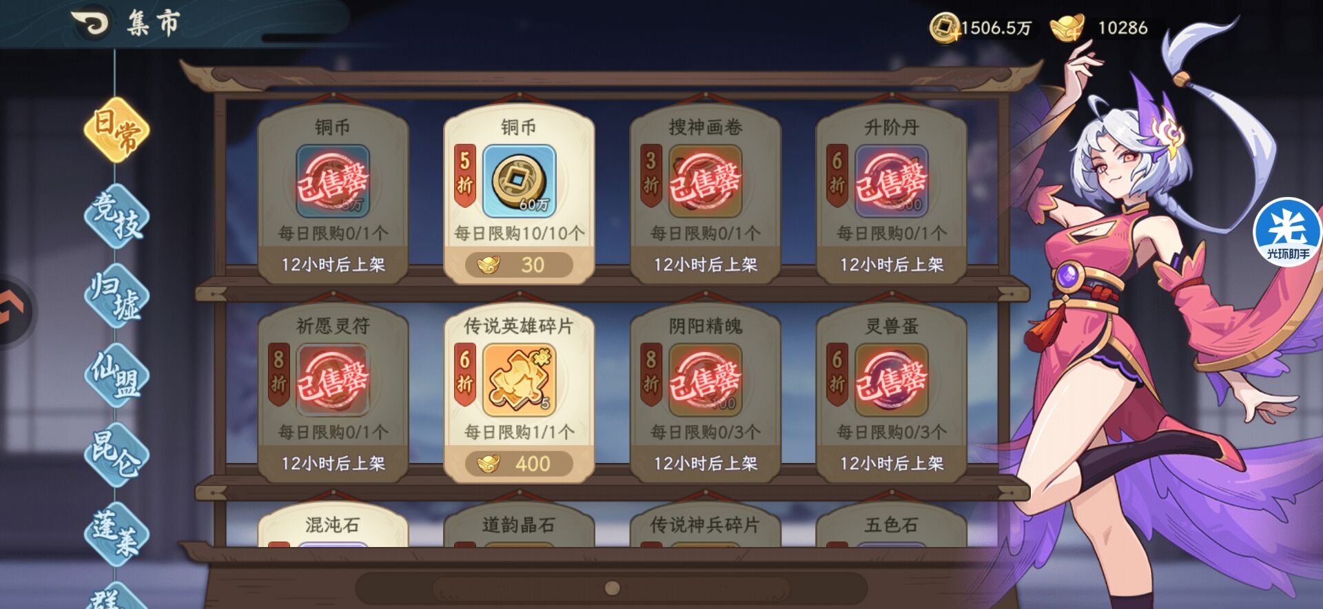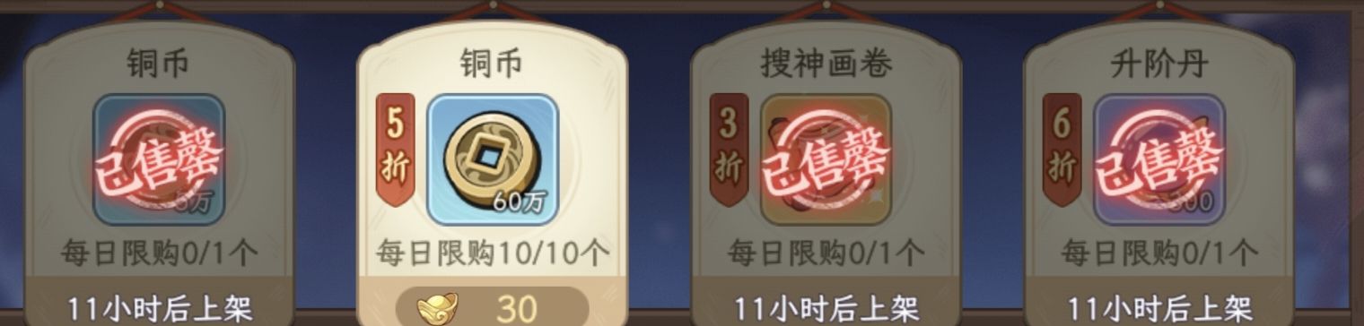 1:每日必买:每日免费铜币、3折搜神画卷、6折升阶丹。