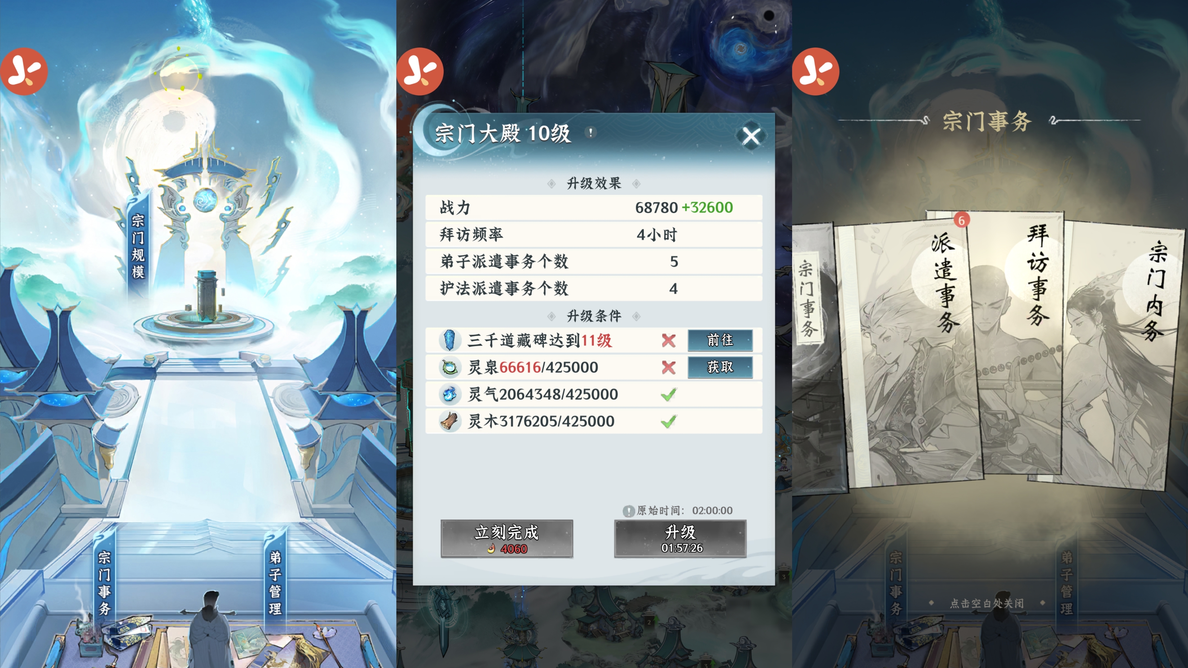 ②作用:山门是我们第一道保护屏障,其他宗门攻打我们的时候会消耗宗门的耐久,提升宗门等级可以提升耐久度和恢复速度。