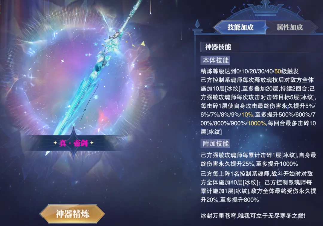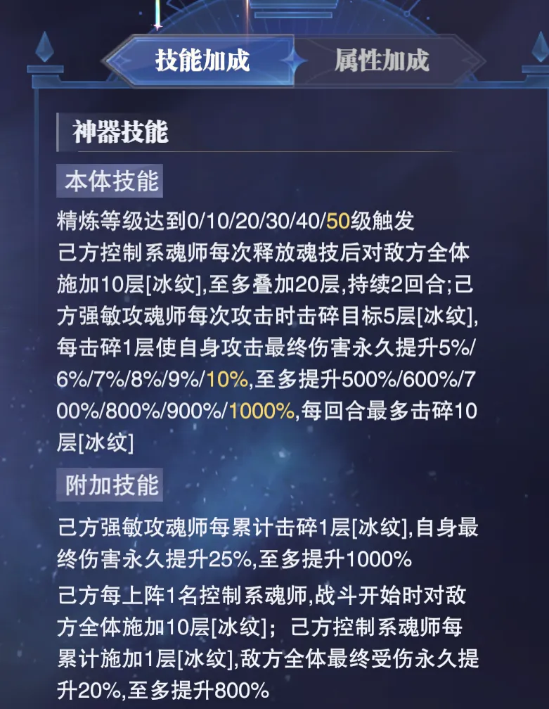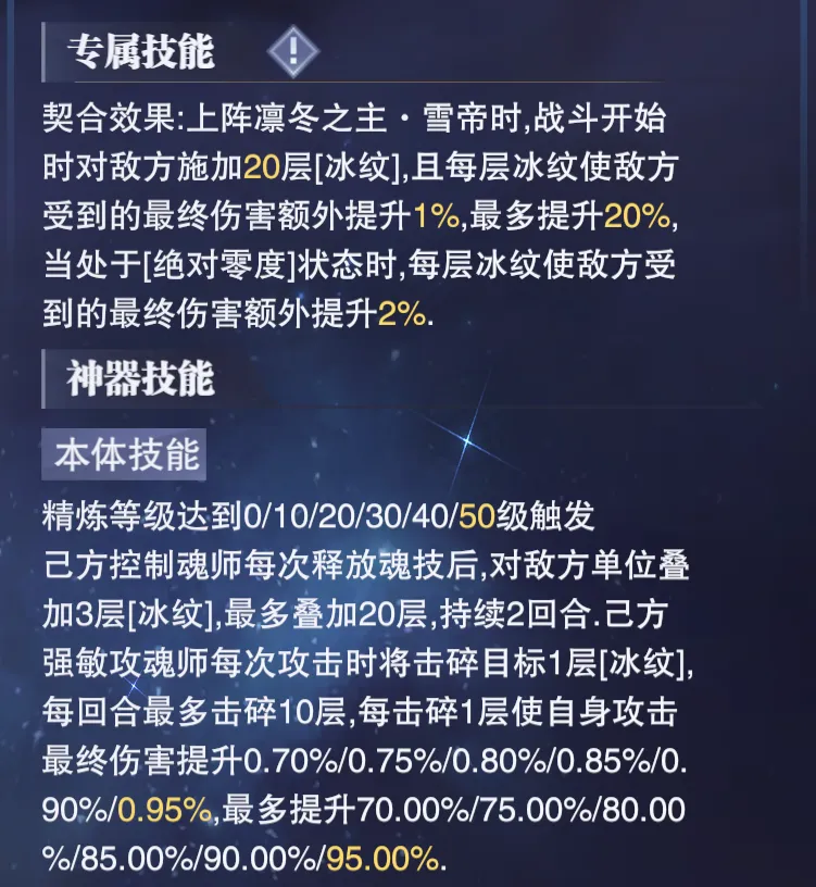 由于其主要是通过控制系角色使用技能后可以给对方施加的“冰纹”状态来提升我们的最终伤害,但核心问题就是“冰纹”基础最高的叠加层数只有20层,且咱们的强敏攻主C还会在攻击中不断击碎“冰纹”,虽然击碎后也可以逐步提升我们的终伤,但提升幅度相对并不算高,且由于目前SP+尘心的阵容在中后期我方所有的控制角色都会进入到“叠剑”状态,所以自然也就无法通过使用魂技来补充“冰纹”了,因此这个神器在之前的使用中就一直比较尴尬,同时也并不能提供多好的实战增益效果。