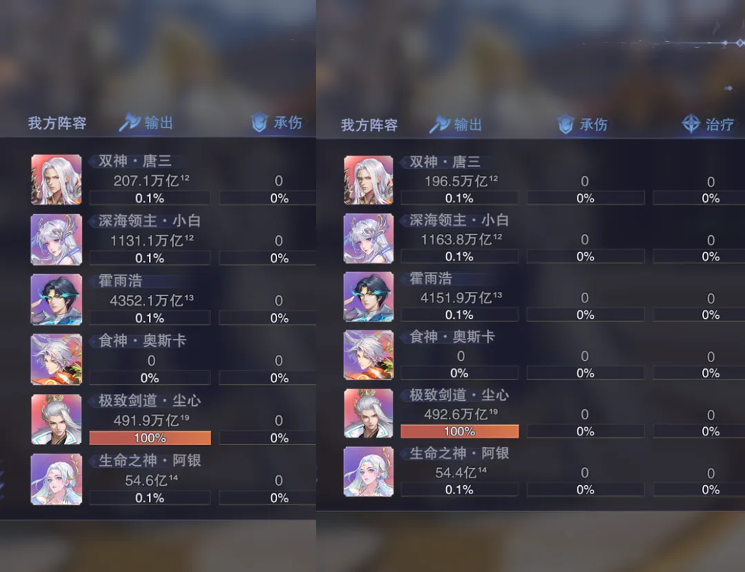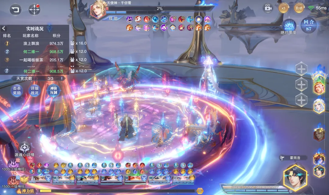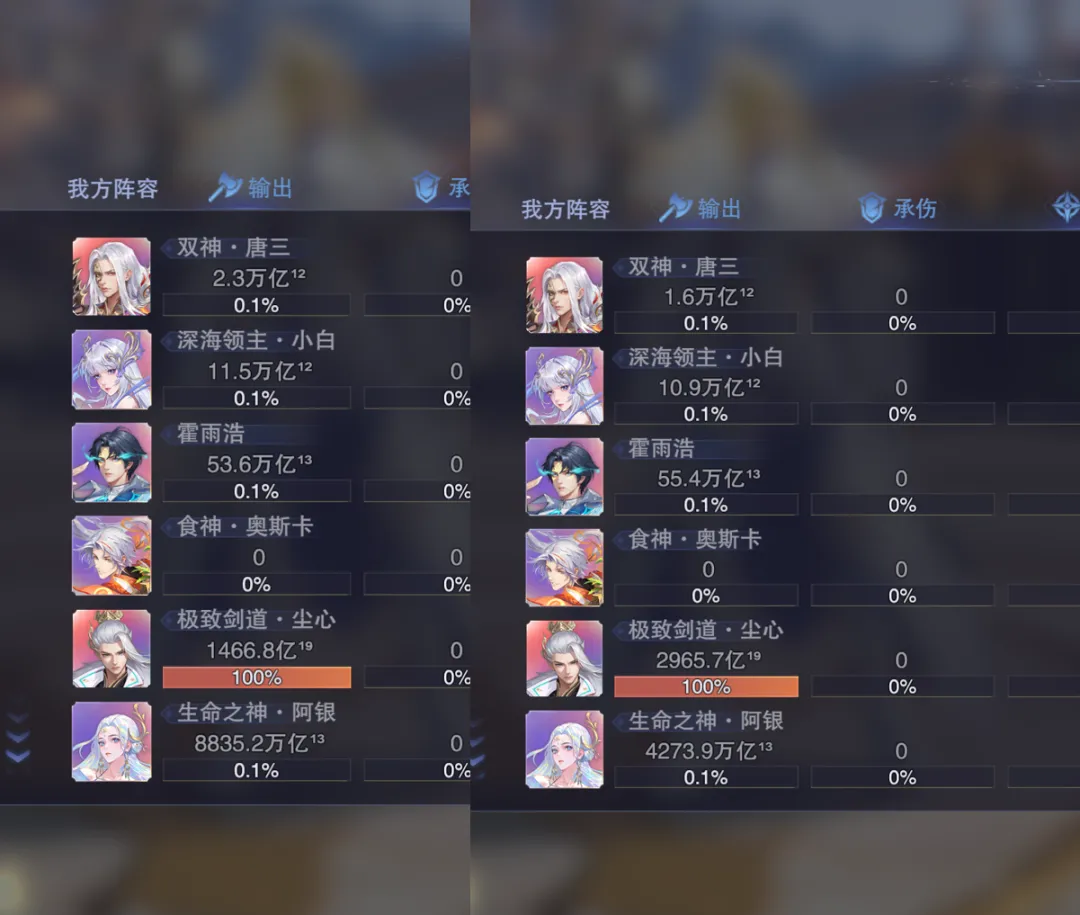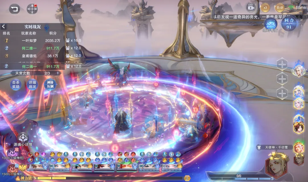 接着我们便直接进入到实测环节,以下测试均是以没有装备真神器器源前的帝剑和激活真神器并将其升到满级50级后的效果作为对比,大家还请参考,测试分别对应了短图爆发和长图伤害两方面的变化,不过由于目前游戏中的数值早已崩溃,以下结论仅供参考。首先是短图测试,在没有激活真神器前的阵容伤害大概可以达到2000亿¹⁹左右,这个数据大家先行参考一下。然后在激活并拉满了真神器后,这个短图的伤害可以立刻提升到约500万亿¹⁹左右,较之没有没有激活之时的提升幅度约为2000多倍,这个提升幅度对于过去的真神器来讲就算是一个相当不错的水平了,大家可以参考一二。不过到了长图里边,这个伤害就有点奇怪了,首先因为目前世界悬赏、神墟悬赏等战场官方都不开了,今天的悬赏我们只能打最新的“众神天赏”,所以其再也不是过去那种直接打伤害的计算模式了,而是取而代之用了积分来计算,此外这个长图悬赏还有神阶值的一些影响,所以维一也只能做到尽量的一致性对比,咱们就打一个boss,然后神阶值我们保持一致,boss的神阶值也保持一致,而在没有激活神器前我们大概可以打出900万左右的积分。而到了完全激活神器后,保持和上边一样的战斗环境,我们的伤害也同样是在900万上下徘徊,并没有产生绝对的数值提升,那么因为目前悬赏也看不到具体的伤害数值,所以不知道是这个积分计算的原因导致的没有增长,还是一些其它的因素导致的没有增伤,大家也可以留言来探讨一下自己的看法。所以综合来讲吧,雪帝真神器的短图爆发增长还是相当明显的,但是长图目前因为各种因素的干扰就看不出来有明显的增长了,这里维一也提一句,例如世界悬赏、战场悬赏都场景我们平时可以不打,但官方你不能完全不开了吧,本来咱们游戏就没有一个固定的长图打桩测试场景,这要把几个常规悬赏一关连个测伤害的地方都没有了,着实搞笑......