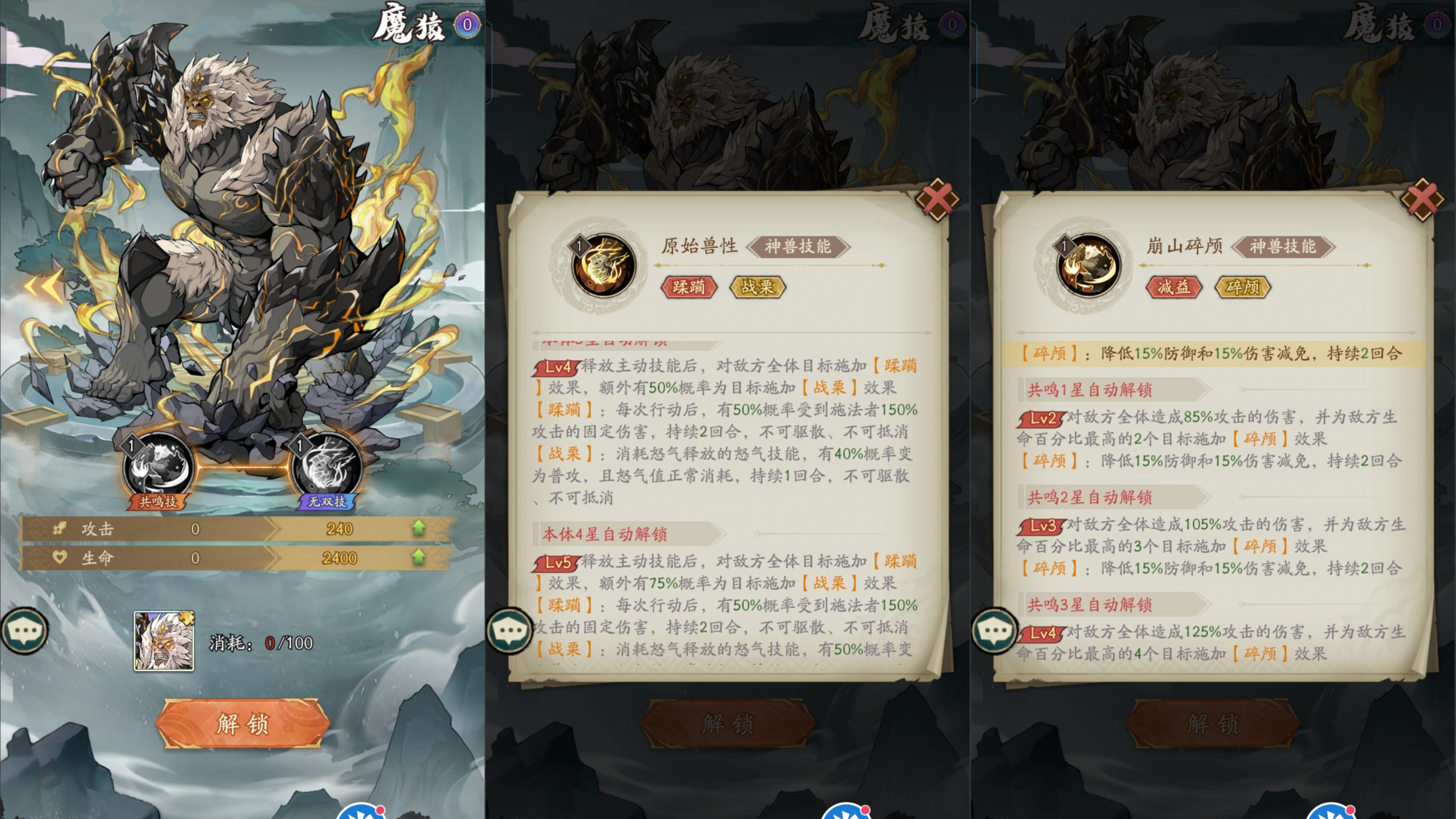 因为战栗4星有50%概率生效,5星有60%概率生效,因此魔猿起码得4星起步才比较好用的!战栗触发的概率会比较稳定一些。