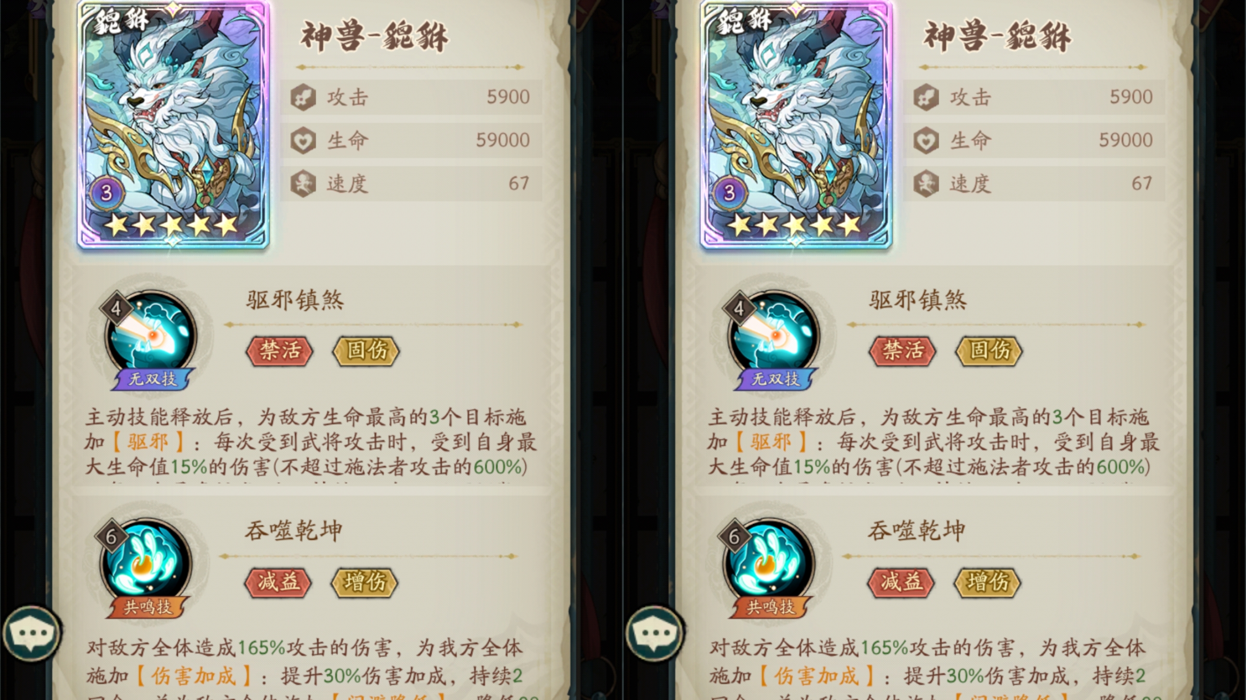 解析:貔貅的作用就是提升我方伤害,并且优先针对敌方生命最高的武将造成最大生命的伤害满星可以造成15%最大生命的伤害,同时还可以让对面复活失败。