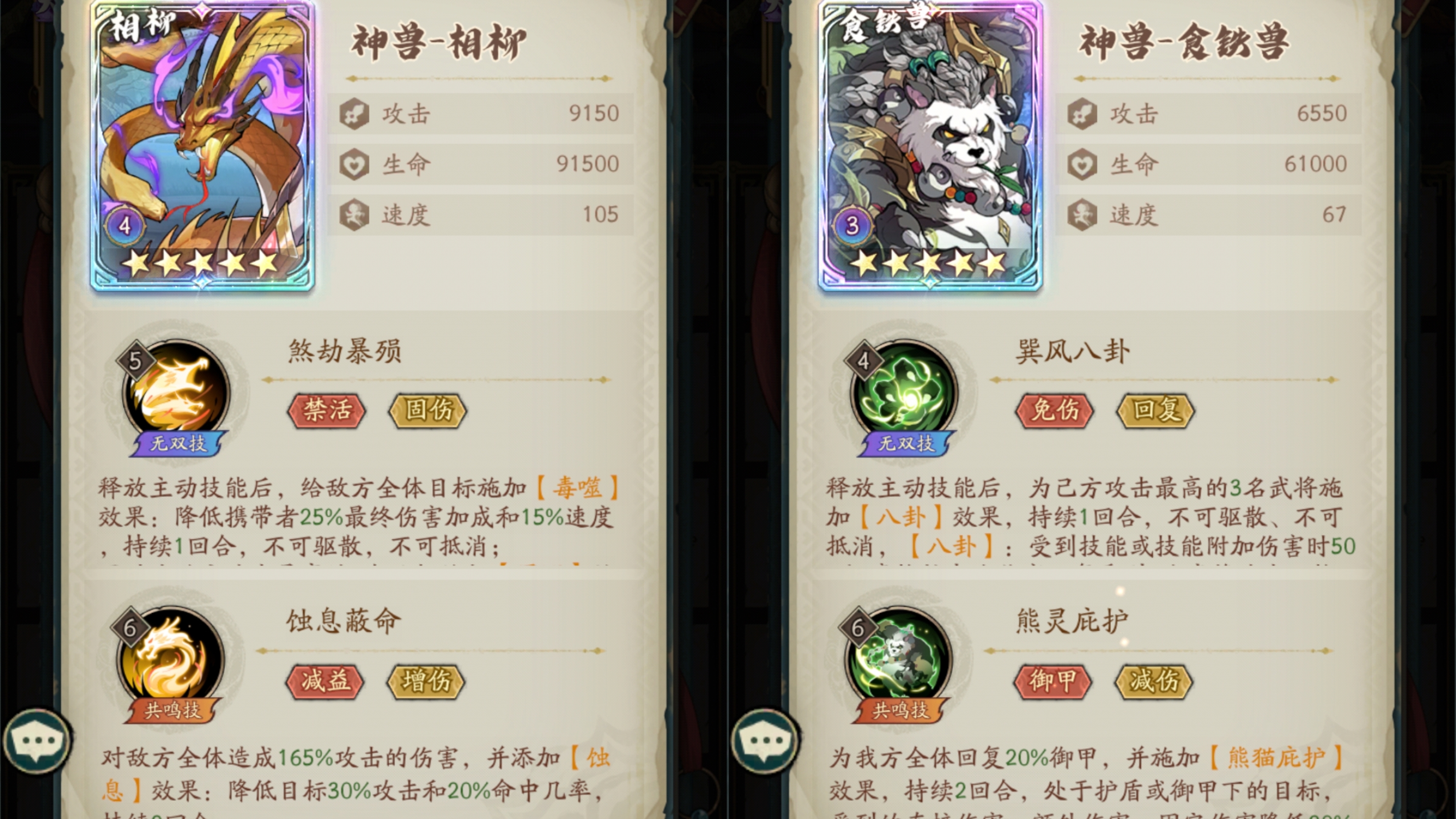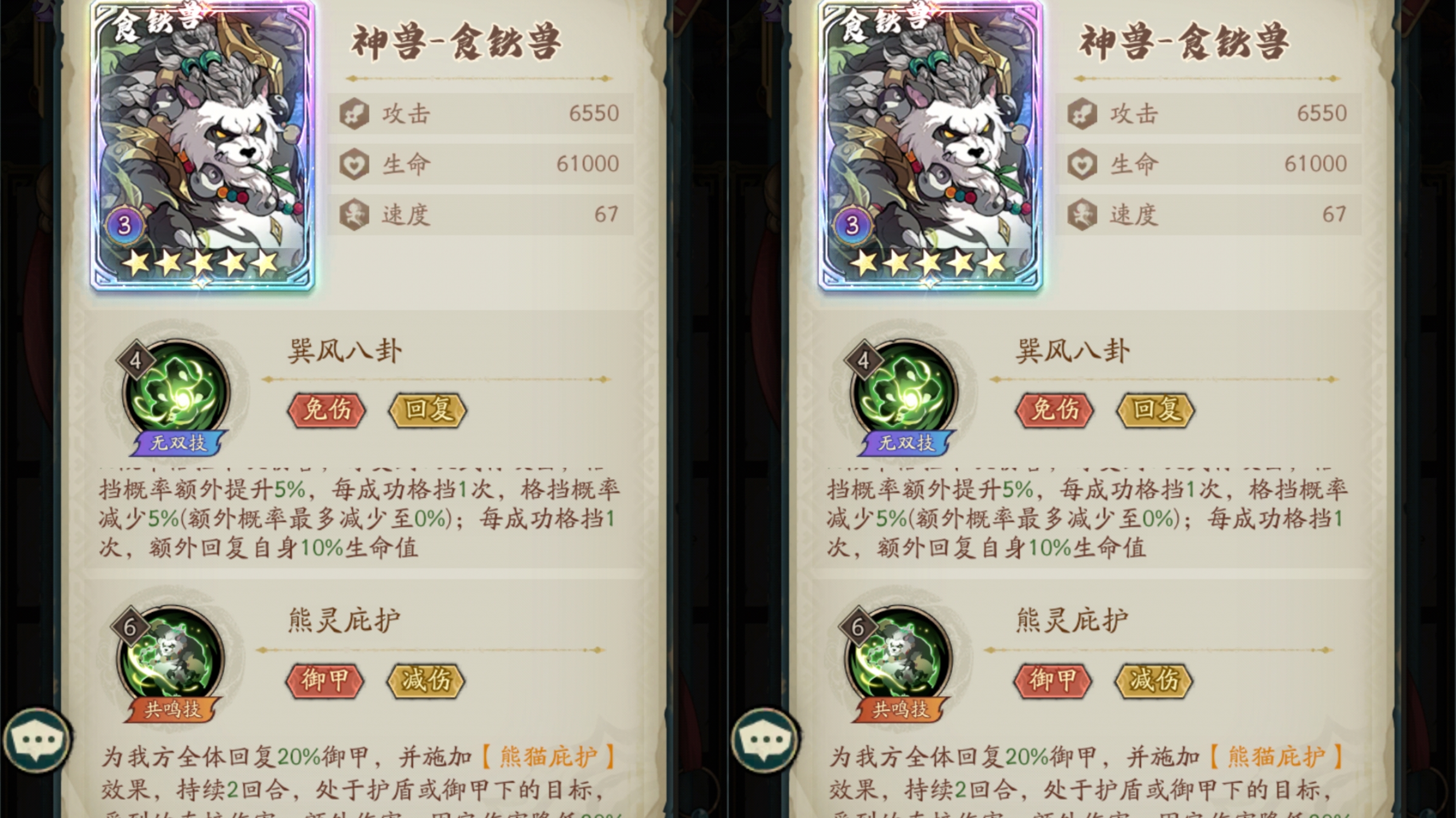 目前初步研究基本可以确定饕餮就是和熊猫🐼一样独一档的神兽!养成优先级也是一档! 和熊猫一样属于必备的神兽。 1:首先非可以确定是常强力的减益型神兽。 3星以上可以考虑放1号位或者是2号位起手降低敌方全体的属性,让我方赢在起跑线。 如果是白板或者低星建议还是放3-4号位比较合适。 2:优点: 最大的优点就是吸收属性!降低敌人的作战能力,3星以后还可以降低敌人的速度和伤害,可以说是人见人怕!机制无敌的神兽。 并且吸收的属性可以持续全场战斗!无法被驱散,非常无解。 3:缺点: 共鸣技的斩杀机制可以被驱散!导致实战触发相当鸡勒!低星不好用!还是一样!3星起步才好用3星才有额外的降低速度和伤害,并且吸收的属性达到最大值。最少也得拉到2星!2星吸收敌人的属性才是满的。