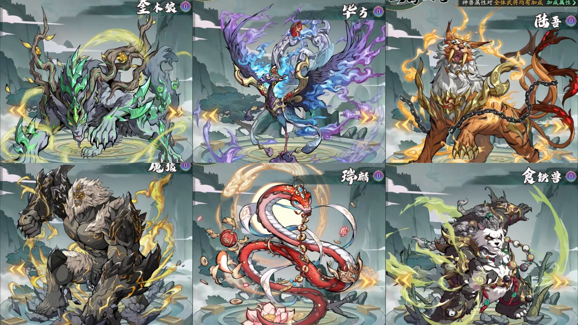 瑞麟、貔貅、相柳、睚眦、奎木狼、食铁兽、毕方、舍舍迦、陆吴、魔猿。