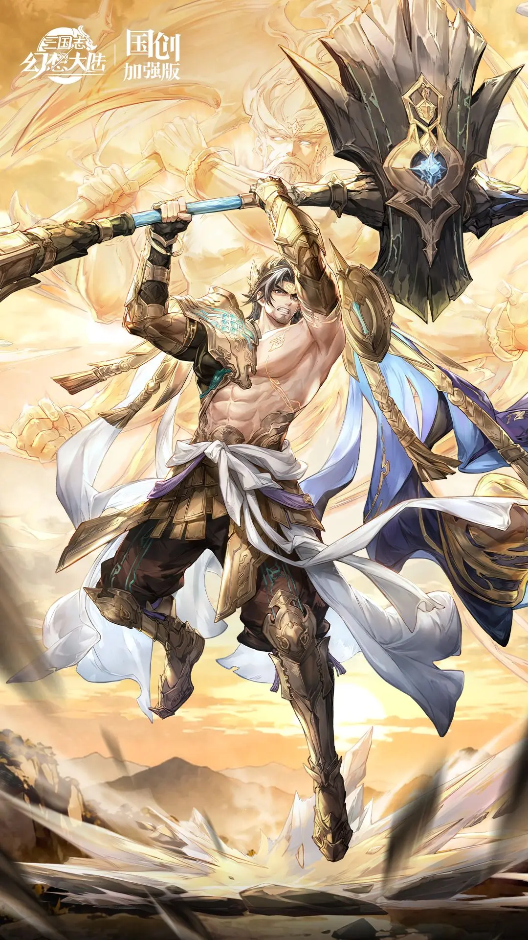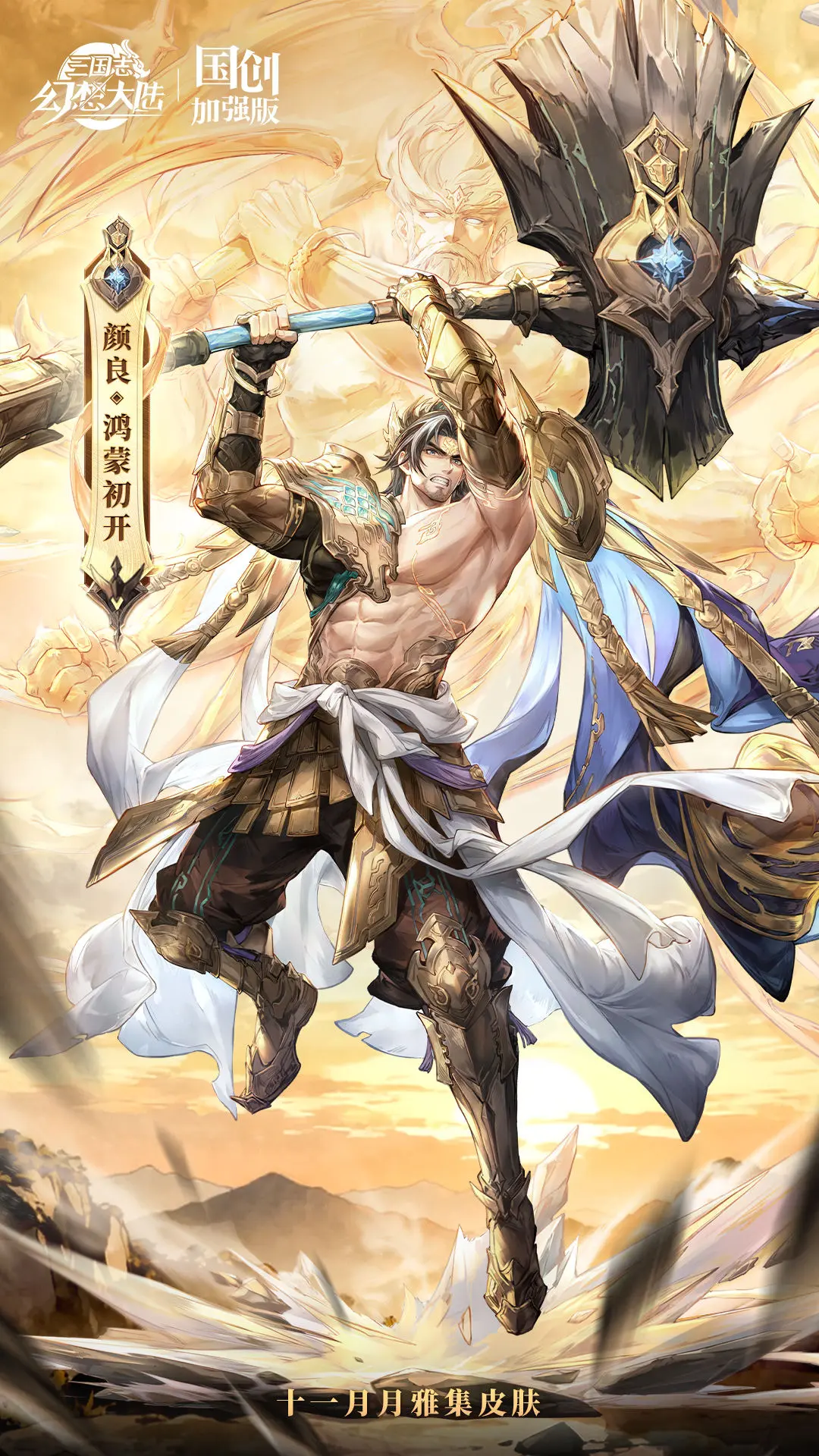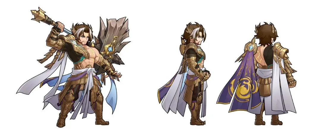 本次设计以“开天辟地”为主题,塑造了一位神力非凡的创世神形象。颜良手握巨斧,为便于劈开混沌,他赤裸着上半身,仅将上衣束于腰间,并佩戴了保护手臂的臂甲。几缕挑染的白发相比原本的发型,为他更添几分神性。当他高举巨斧腾空跃起时,仿佛连脚下的大地也因无法承受这份开天辟地之力而裂开,展现出无与伦比的力量之美。