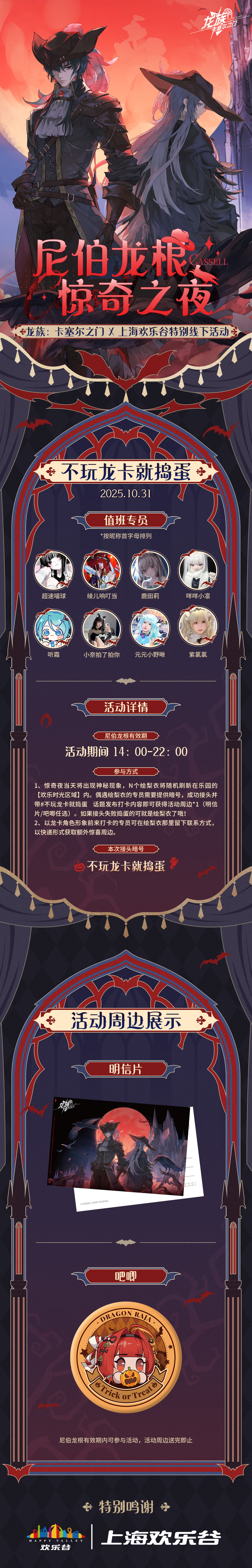 《龙族:卡塞尔之门》x 上海欢乐谷,全新线下联动活动「尼伯龙根惊奇之夜」第二弹即将于10月31日同步开启!活动期间,多位绘梨衣将惊喜现身上海欢乐谷!专员们偶遇绘梨衣,完成神秘接头暗号,并发布话题打卡内容,即可获得「活动周边*1,明信片/吧唧任选」!