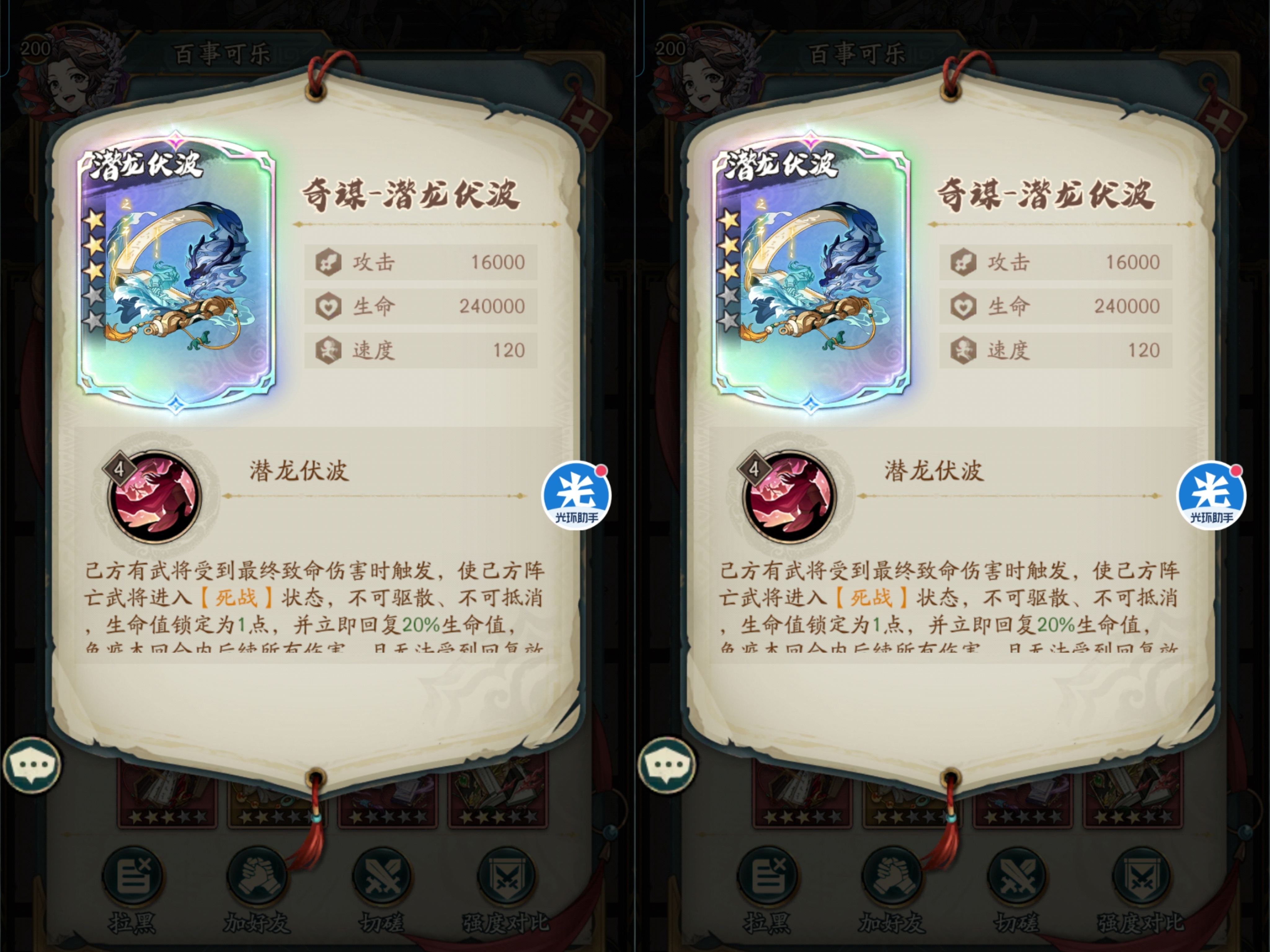 答:可以!别说野鸡凤凰的保命了!就算是【奇谋:潜龙伏波】的死战锁血也是可以直接无视斩杀的!