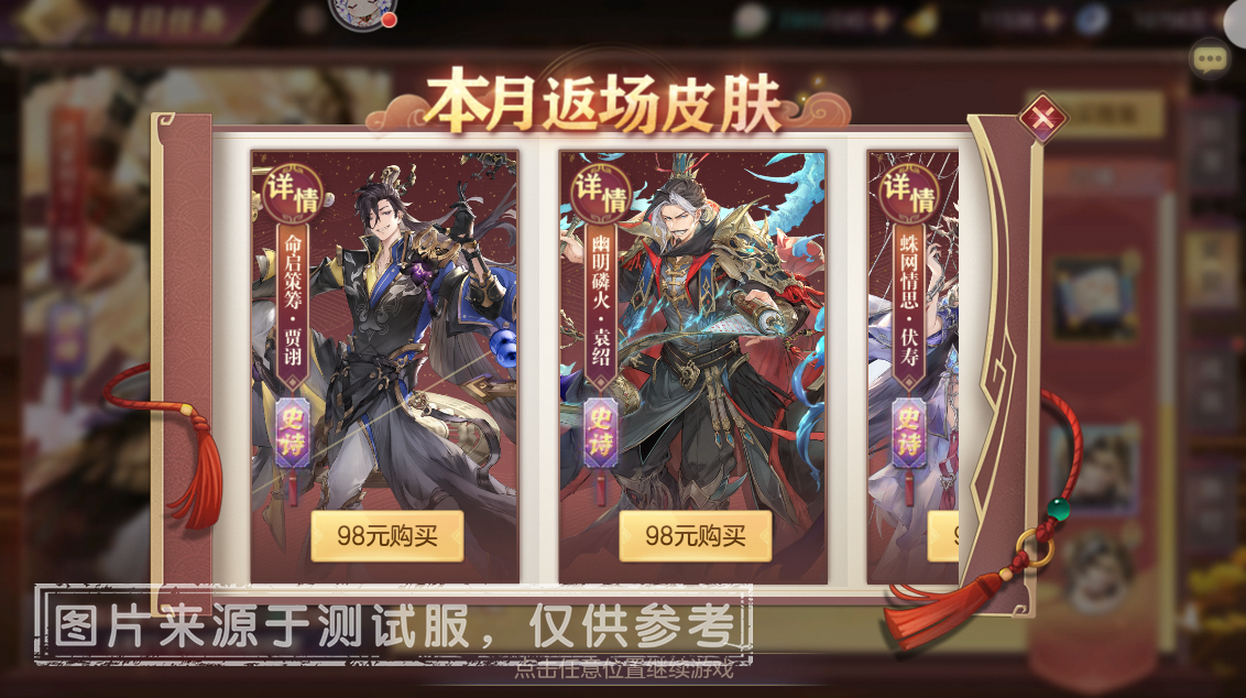 3.本期返场皮肤:命启策筹·贾诩、幽明磷火·袁绍、蛛网情思·伏寿