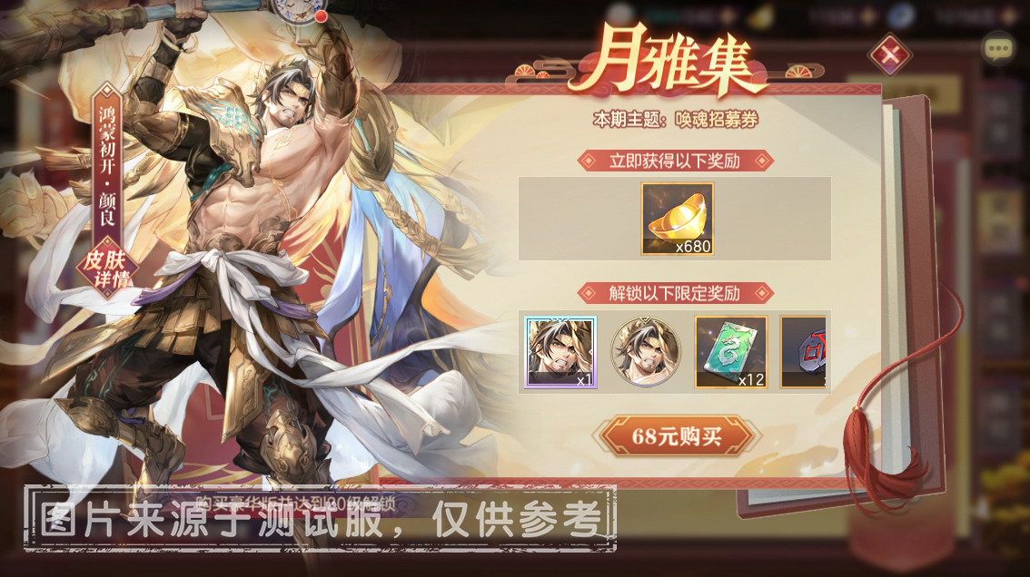 小将军可以通过每个月度完成“每日任务”获取月雅集进度,解锁“月雅集”标准奖励。另外,额外付费68元解锁“月雅集豪华版”后,达成指定等级可获得每月限定史诗级皮肤(本月为鸿蒙初开·颜良)、主题奖励(本月为唤魂招募券)等资源,助力小将军闪耀三国! 同时,本期月雅集皮肤返场分别为命启策筹·贾诩、幽明磷火·袁绍、蛛网情思·伏寿!
