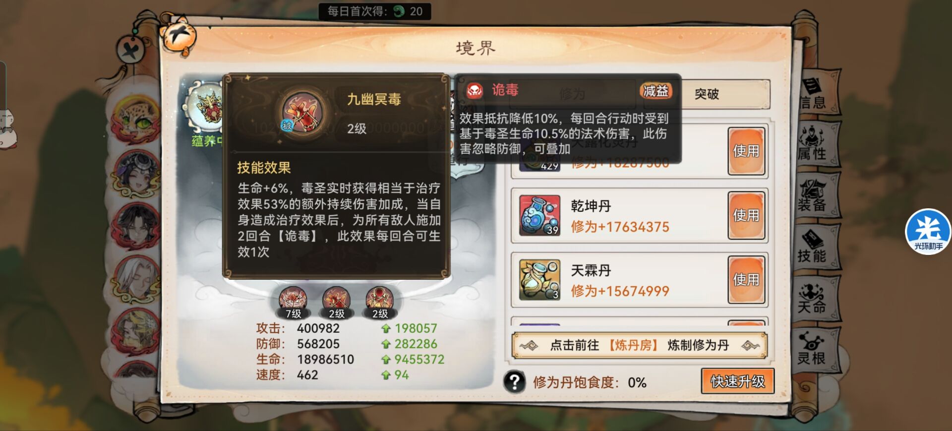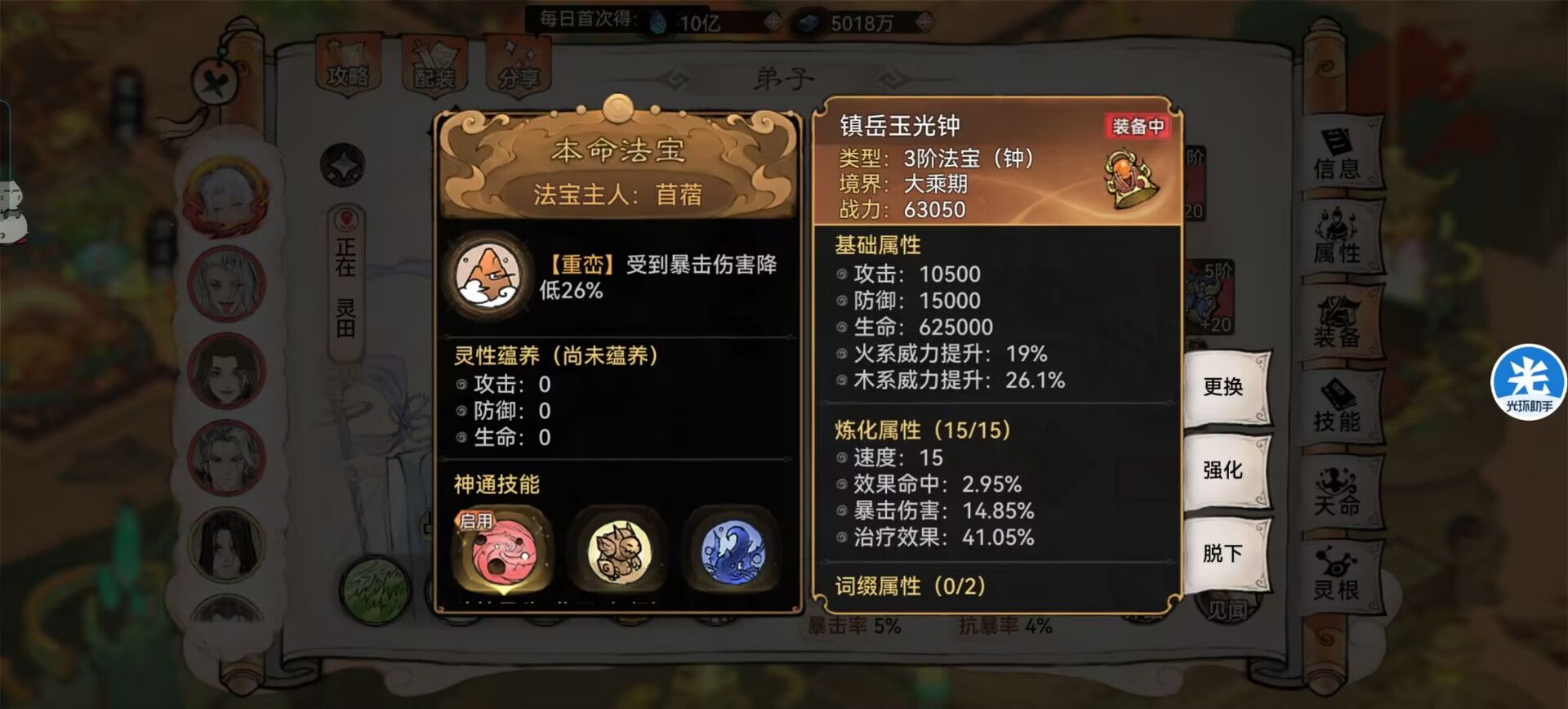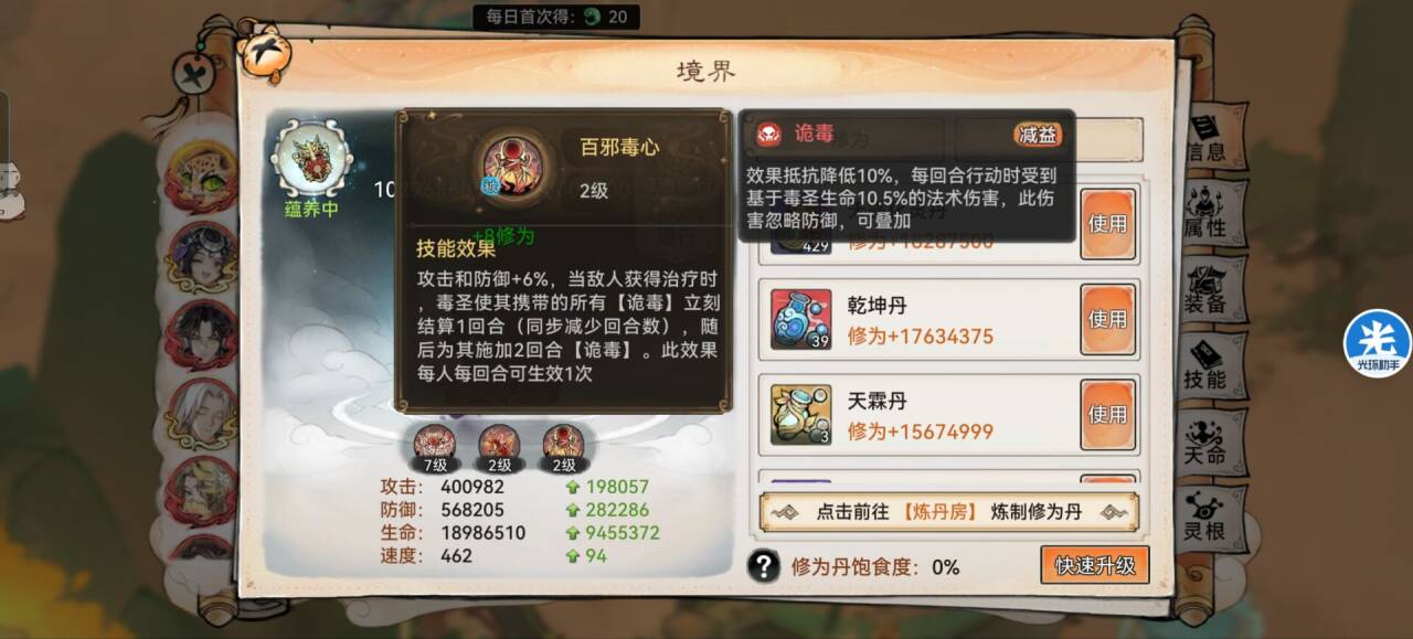 3:【法宝】属性炼化推荐:效果命中或者生命。解析:命中不够就优先选择命中,不然诡毒挂不上一切都百搭。
