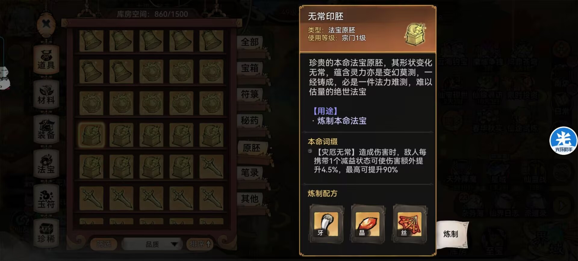 ps:本命法宝胚子尽量选择有【藤】和【丝】的副法宝,这样可以来回切换法宝的使用。