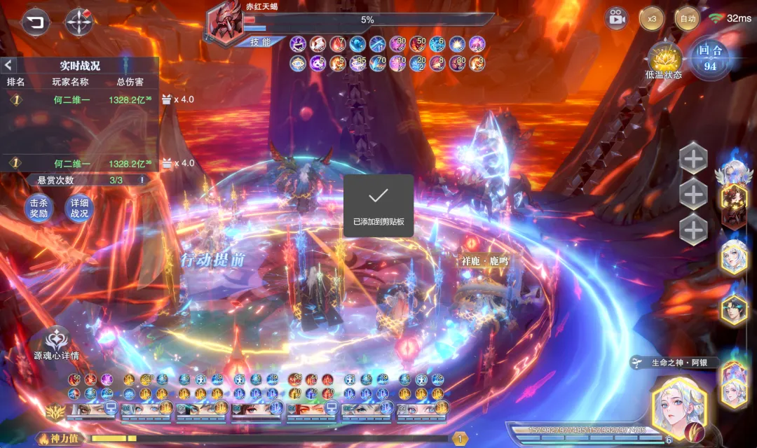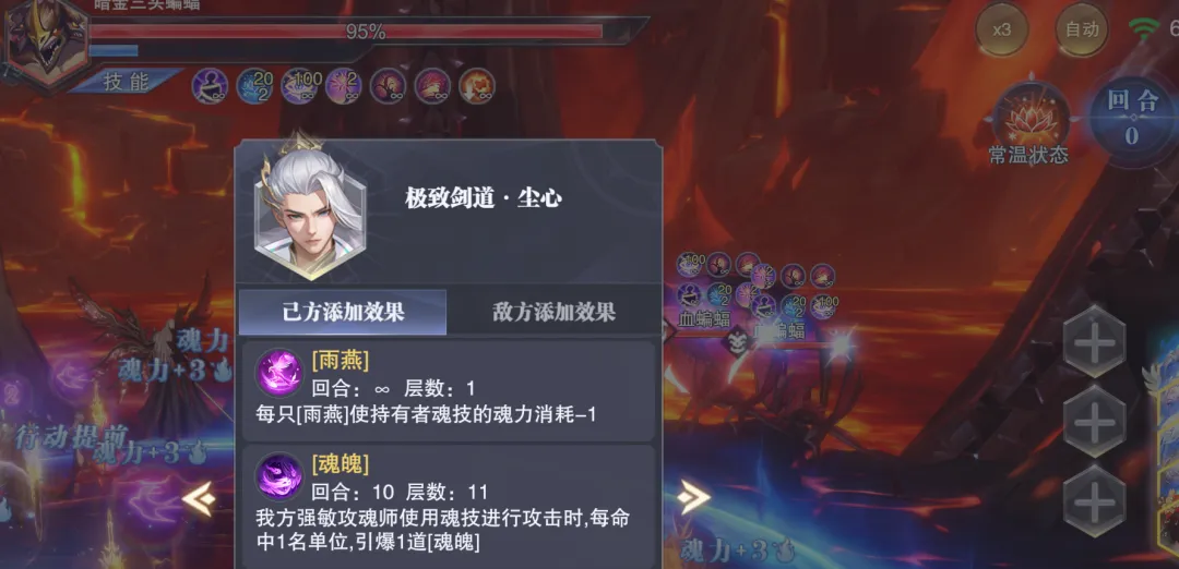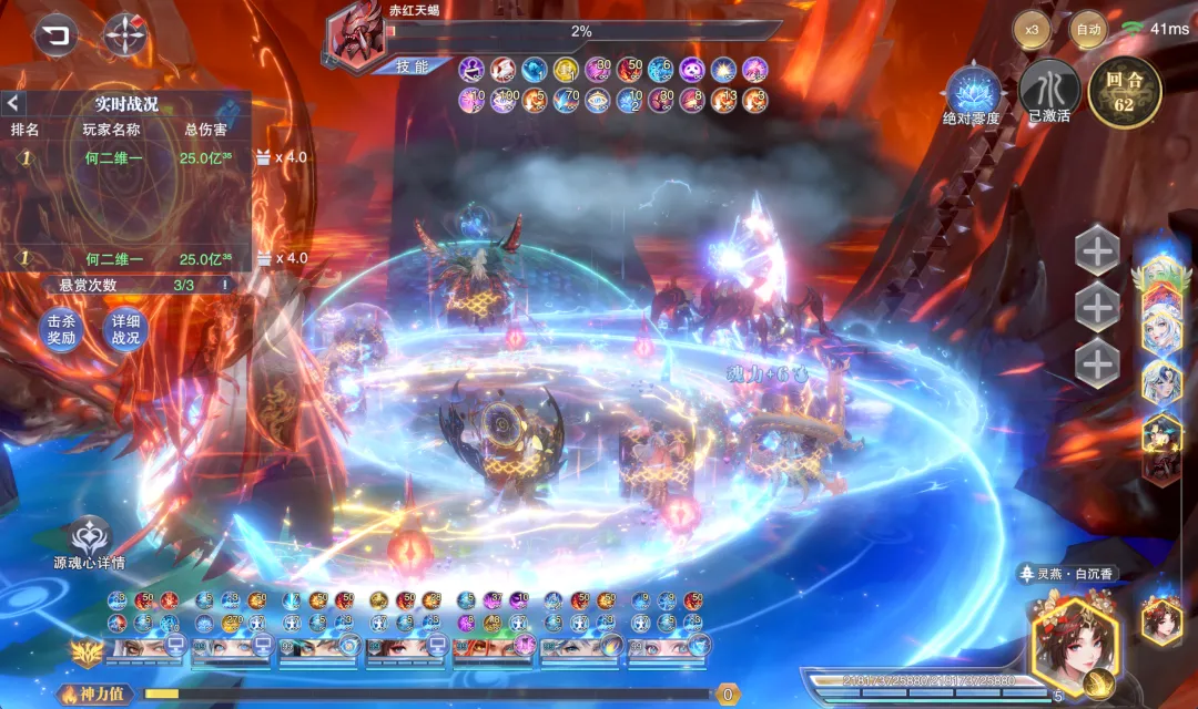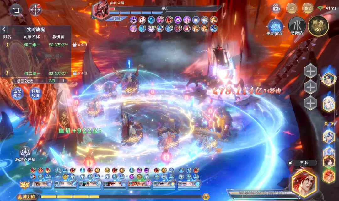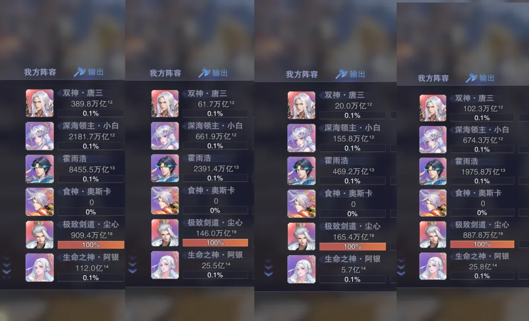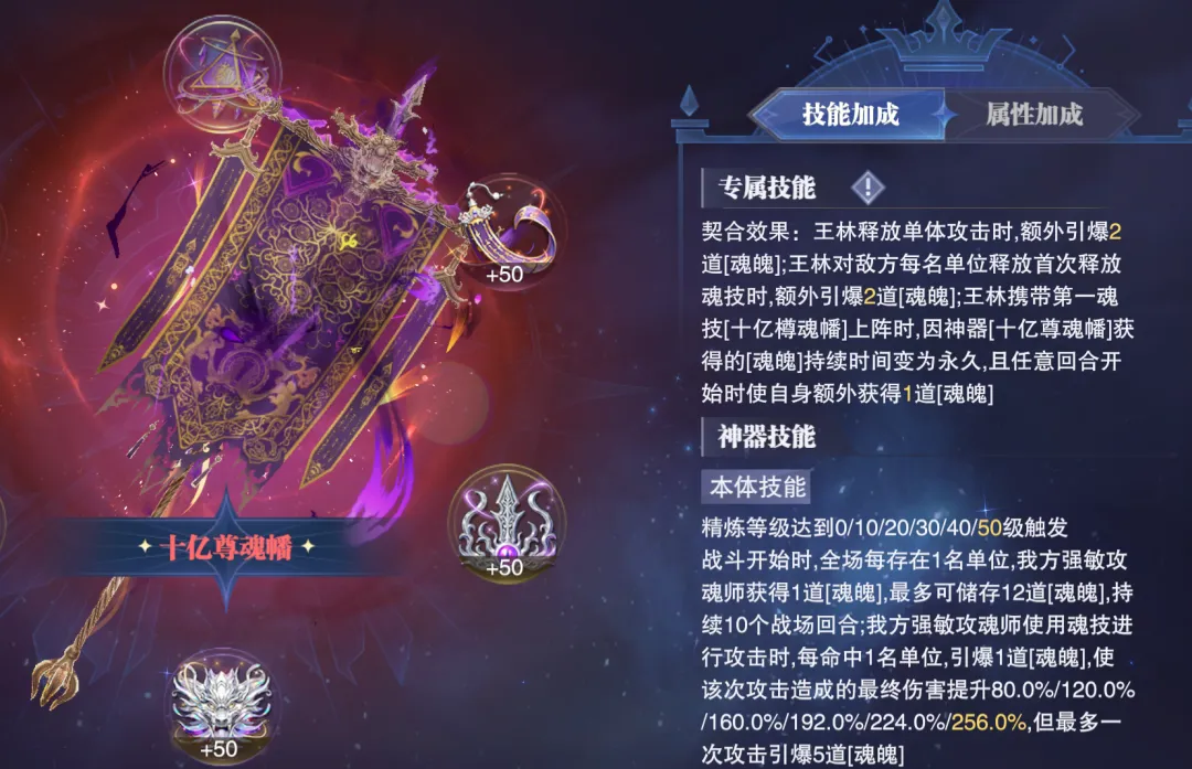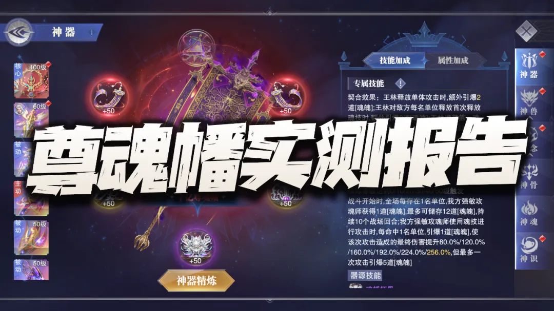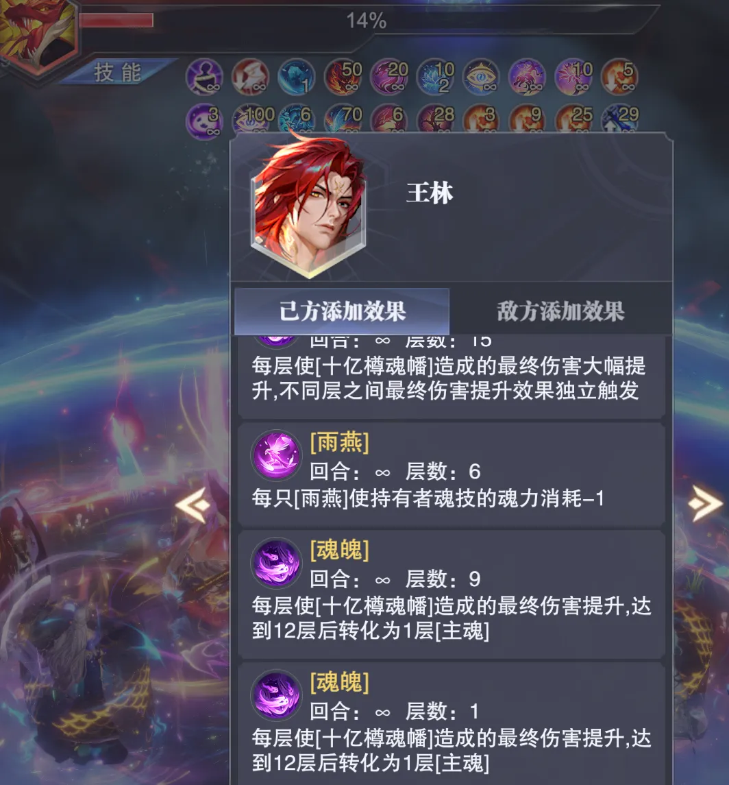 首先这个十亿尊魂幡的效果针对常规主C来讲更多是短图或快速PVP的爆发辅助,因为这个“魂魄”状态只能持续10个战场回合即会失效,通过下图大家也能看到这个状态的持续时间在非王林上阵的前提下是没啥问题的,所以针对非王林主C的状态,十亿尊魂幡对如SP+尘心等常规主C而言更多就是短图或快速PVP爆发的主动神器了。不过当我们把主C换成SP王林后,在实测过程中维一就遇到了一个奇怪的问题......因为王林本身就会自带一个“魂魄”状态对吧,这个魂魄状态还会不断转变为“主魂”状态,所以我个人的理解是不是他自身技能所带的“魂魄”和神器十亿尊魂幡提供的“魂魄”就是一个效果?PS:这里大家可以在上图中稍微注意下神器十亿尊魂幡提供的“魂魄”状态说明,这个说明其实和王林技能自带的“魂魄”说明是不一样的,接下来我们也可以以此为标准来分辨两个魂魄状态。而当我们把主C替换为SP王林后,奇怪的事情就出现了,大家在战斗开始和前10个回合内都无法在状态栏中找到任何有关于神器提供的“魂魄”状态说明,而此时王林的状态里边只会有一个“魂魄”效果,那么由于这个魂魄的图标和神器提供的魂魄图标是一模一样的......(大家可以对比上图和再上边的那张图)所以初看来其实无法分辨,但如果仔细看其描述则明显是和神器提供的“魂魄”buff不一样,所以当王林作为主C上阵时,到底神器提供的魂魄是否和其本身技能自带的魂魄会一视同仁呢?但是当我们这样理解后......更奇怪的事情就发生了,这战斗打着打着,尤其是在很多场战斗的中后期,王林的状态栏就会出现两个同样的图标,同样描述的魂魄状态(见上图),这是个啥谁能告诉我?所以这个证据又和我们刚才得出的结论有点矛盾了,所以到现在维一也没搞清楚神器十亿尊魂幡提供的“魂魄”状态和王林技能自带的“魂魄”状态到底是个怎样的计算关系......当然这点也欢迎大家留言来聊聊自己的看法了。接着我们便进入到实测环节,针对常规主C咱们更多做短图爆发的对比测试,而针对王林主C我们则可以做一做长图单桩悬赏的测试对比。PS:哦对了,以下测试条件维一只能把十亿尊魂幡给抽到5个器源且把器源与神器等级都拉满,彩色器源嘛实在是抽不起了,还请大家见谅,所以如果是满器源和满等级的十亿尊魂幡,其效果还会比下面呈现出的结论更强些许。首先是第一组短图爆发测试,在带昊天锤神器的前提下,我们的短图爆发队伍大概可以打100万亿¹⁹-1000万亿¹⁹左右的伤害,这个数据大家可以先行参考一下。接着第二组则是带十亿尊魂幡的测试结果,此时我们的阵容大概可以打1亿¹⁹-20亿¹⁹左右的伤害,较之刚刚昊天锤的对比组还是要差不少的。当然维一也顺手做了一组带真七杀剑的对比组,而十亿尊魂幡还是要比真七杀剑稍微强一些的,所以这里短图的大致结论就是,十亿尊魂幡针对SP+尘心等主C而言,很难能超越昊天锤的增伤效果。当然王林也不太可能作为单独存在的主C来打短图或PVP战斗,所以短图爆发用王林来做对比测试的意义也不算很大,接下来我们直接来到王林长图单桩战斗的伤害对比。(打的战场为世界悬赏的强攻系单桩boss,天气为烈日,由于目前游戏中的数值早已崩溃,以下对比结果仅供参考)首先第一个对比组是带真修罗魔剑的阵容,此时的伤害大概会在50万亿³⁴-500万亿³⁴上下徘徊,这个数据大家可以先行参考一下。接着当我们把神器替换为十亿尊魂幡,此时阵容的伤害会立刻提升到约5亿³⁵-50亿³⁵间徘徊,提升幅度约在1000倍左右,大家可以略作参考。不过当我们把主C替换为SP+尘心,其伤害还是要远远超过王林的,即便考虑6器源的增益,这个伤害也很难能超越SP+尘心,所以针对长图的结论,维一个人还是倾向于有十亿尊魂幡的确可以让王林在长图单桩中的伤害有所提升,但其依然很难撼动SP+尘心的地位。所以十亿尊魂幡这个全新的主动神器嘛,在中后期区服里边的作用还是一般的,大家可以按需考量,不过在前期的新区里边嘛......因为特殊的原因可能其对比效果就会稍好一些了,最后当然也欢迎大家留言来参与讨论吧!