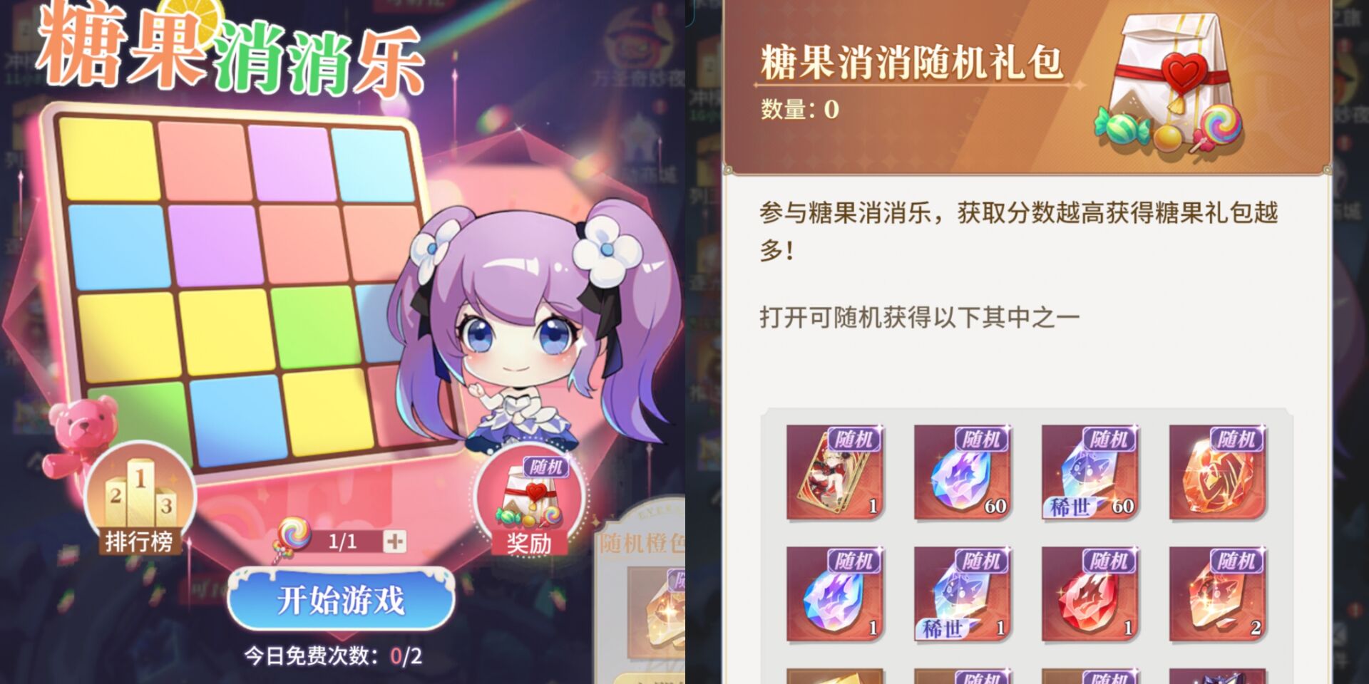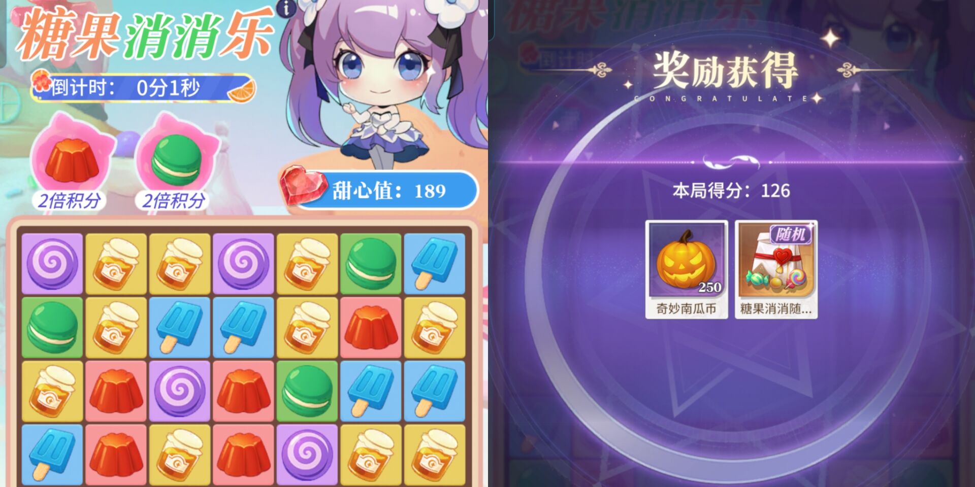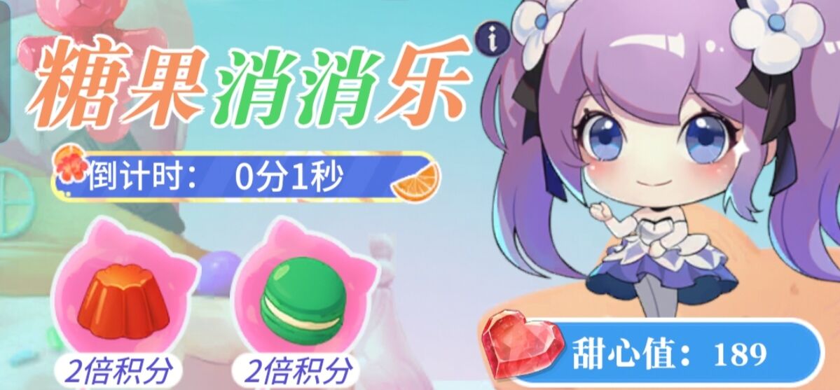 ③开局都有60秒的游玩时间,消除的糖果越多获得积分越多,积分越多=获得的糖果消消礼包越多。