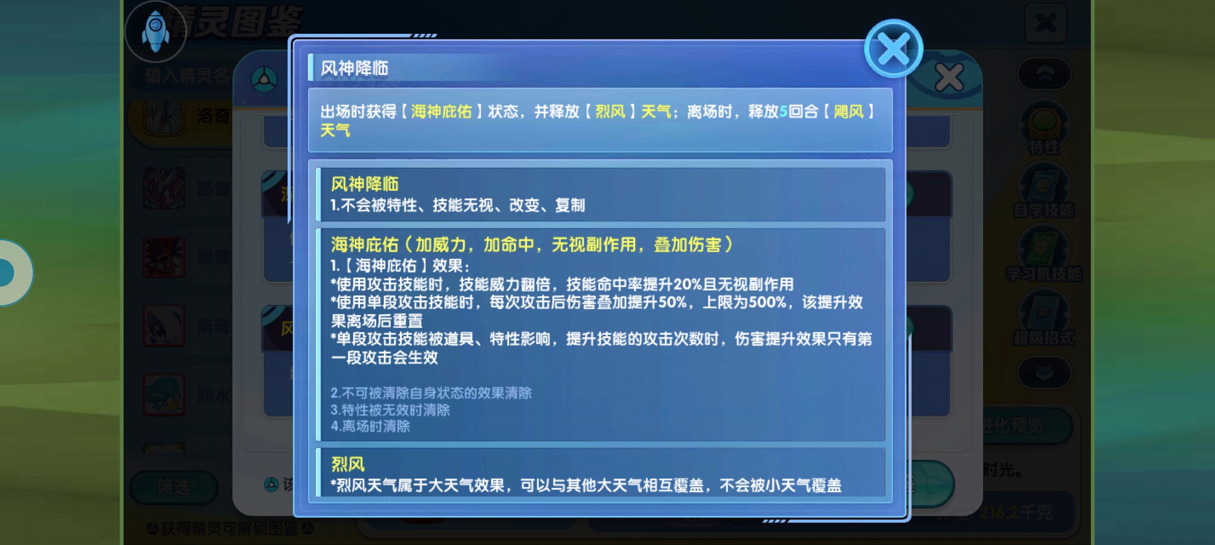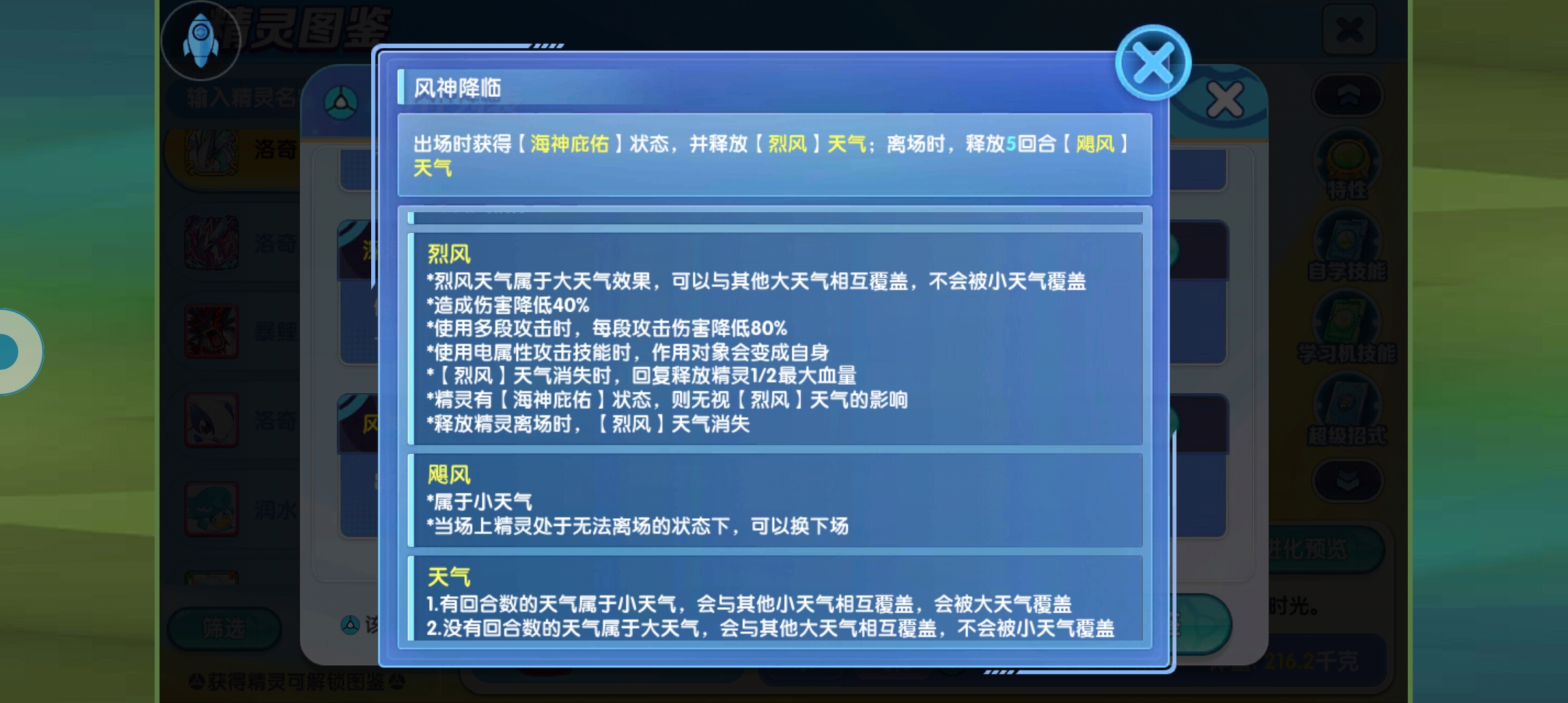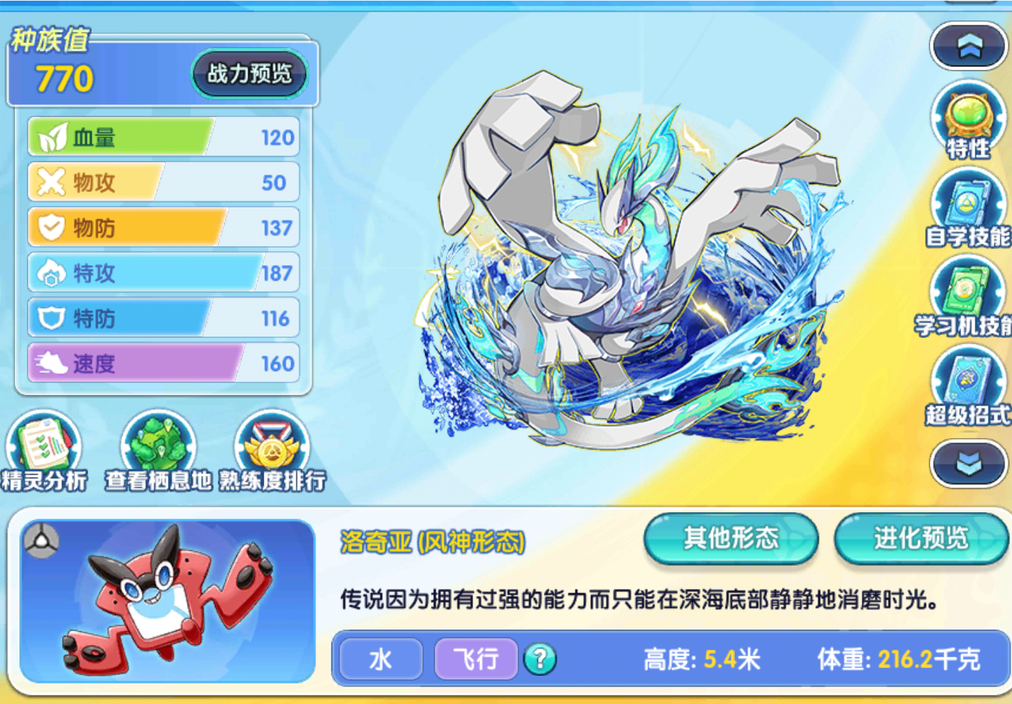 自身的特性的话,拥有能够让队友逃脱的效果,而且自身拥有增加命中加伤害的效果,不过有一条还蛮有意思的,使用电系技能的时候会作用自身,这个效果是什么意思呢?就是如果对方使用电系打我们,那不好意思,对方自己打自己因为自身有一个庇护效果,而这个庇护效果可以无视这个副作用,自身使用打雷是不会自己劈自己的,但是对方使用打雷是会自己劈自己的,如果是两只洛奇亚之间打内战的话,那就不好意思了,都有庇护效果,所以这条效果当场报废还是需要注意对方的打雷,但仅限内战。