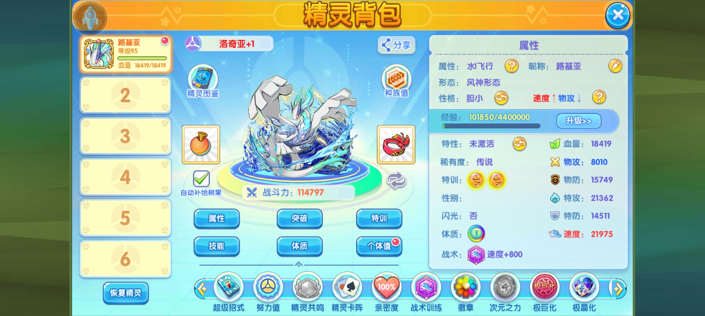 这里看一下属性的面板,大家可以看到我这边给大家做参考的是一个高速高功的面板配置参考,当然了,像这种面板我是不建议的,因为普通形态最主要的还是要靠它的血量来保持存活能力,这里只不过是给大家做一个参考罢了,如果有玩家想要依靠滋润的高速度,高爆发的话,可以考虑这个,速度和特攻都是突破2万多,可以说是很不错了,因为这个精灵,它的特攻面板看似比较低,但实际上伤害全部来源于它的特性效果,而并非是这个虚假的面板,但是速度是不会骗人的,除了一些老宠物拥有种族继承机制,那就当我没说。