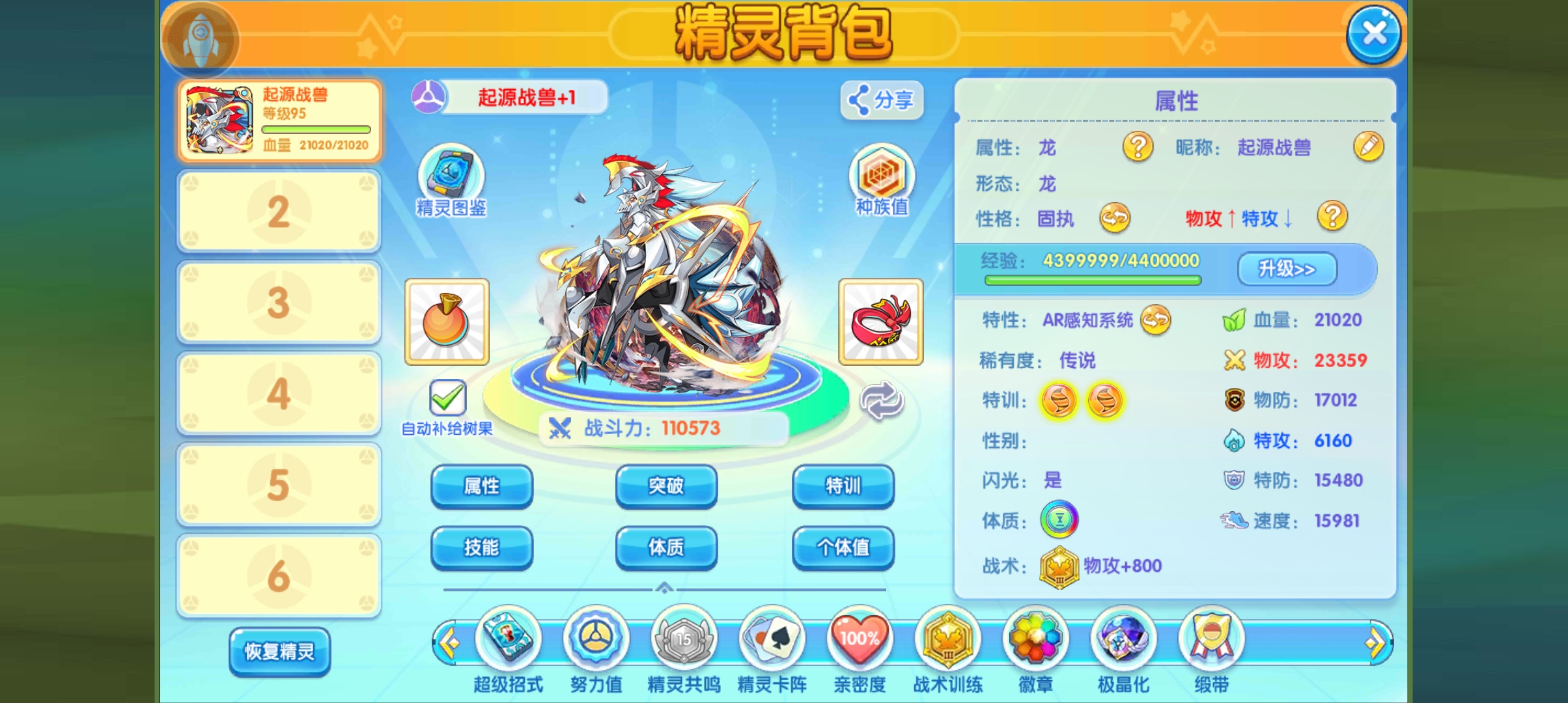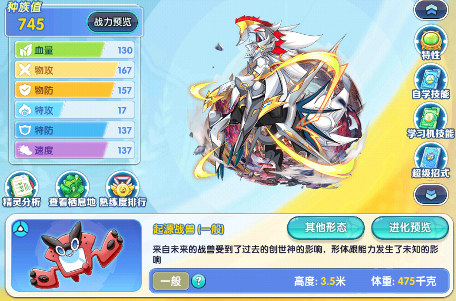 起源战兽在这次版本更新是强化了特性效果。种族的话,我也是和原本的之前进行过对比,发现二者都是一样的,但特性加强,就足以让这个精灵强度攀升不少,自身就是一个小创世,能够变更18种属性种族配置的话特攻低,然后其他属性都是优势。