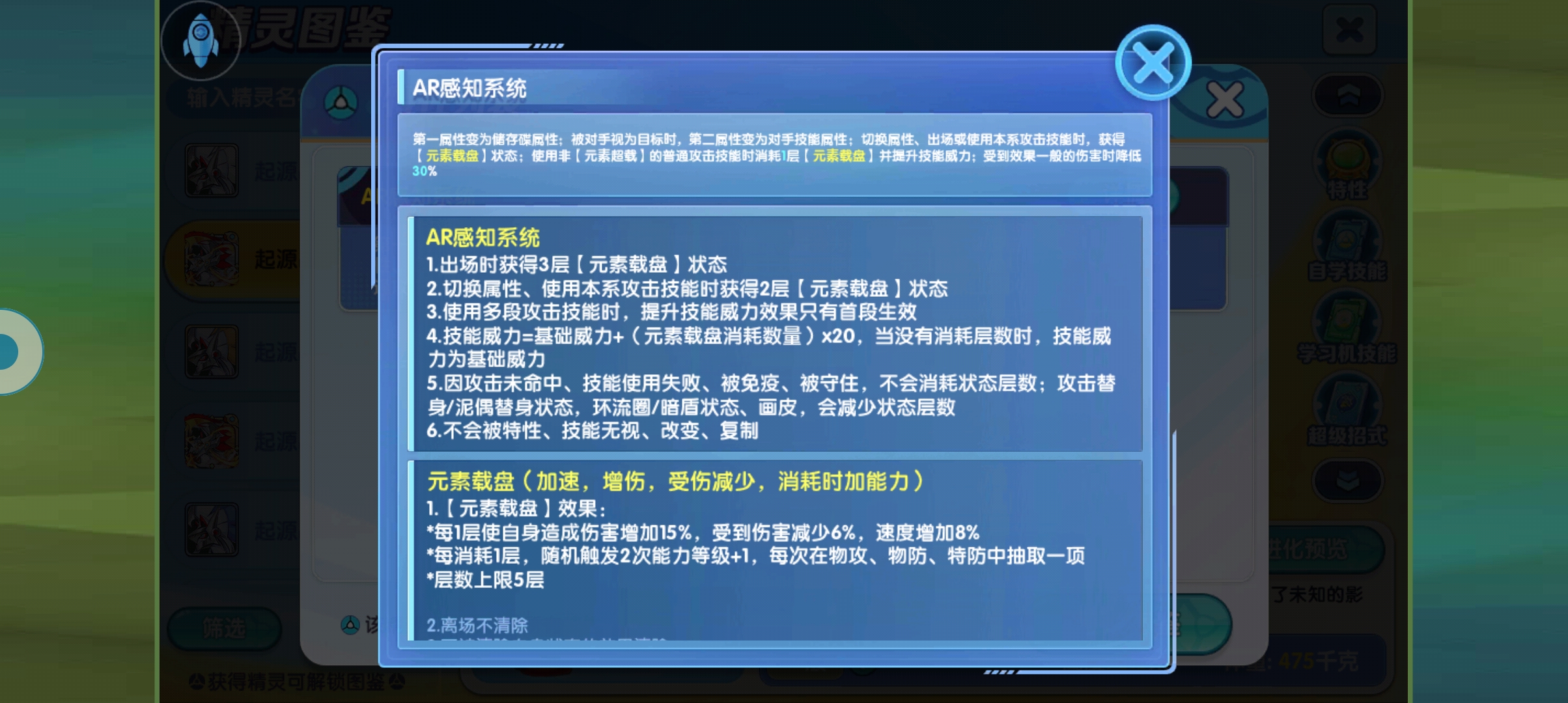 特性的第二个效果是自身受到伤害时,自身的第二属性会变成对方的攻击属性,就比如说对方使用火系打我们,那我们就变成龙火系,然后自身出场可以获得元素载盘三层,如果使用本系技能和切换属性的话,还会获得两层,拥有元素在盘的时候会增加速度和伤害,并且还会增加自身的能力等级,大家可以去看上方的特性明细就可以了,那么想要玩好这个精灵的话,就必须要保证自身拥有五层的元素载盘,一般来说,自身挨打和登场三层保底就是五层。说实话,看似特性比较复杂,但实际上比较简单,挨打有防御,输出方面也不低,自己的元素载盘层数越多伤害就越高,更关键的是,自己还可以增加能力,进一步提高自身的伤害或速度。