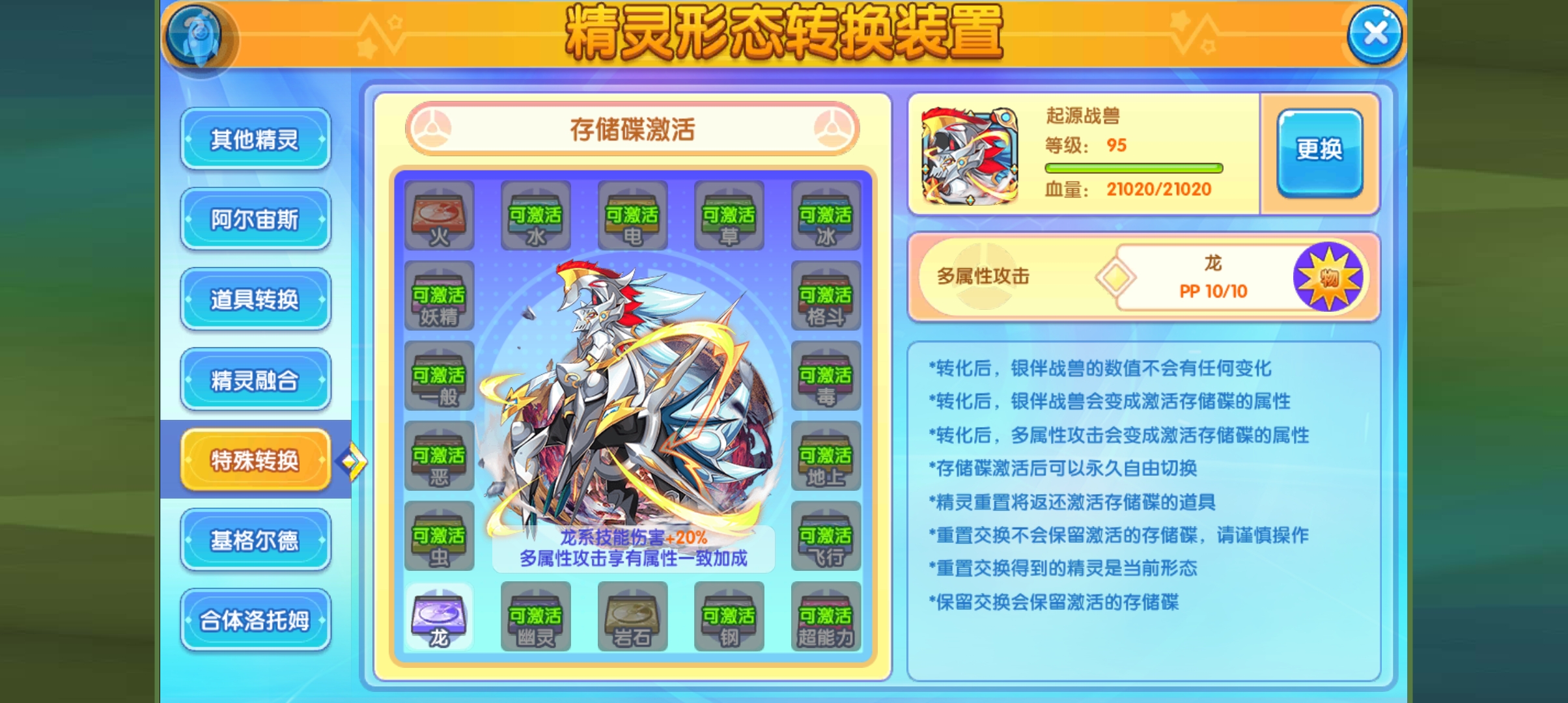 大家可以看到这个就是起源战兽的专属特殊系统配置的,就是使用18种存储碟,这种道具的话大家可以去挖矿功能里面有一个化石挖掘玩法,在里面用道具进行兑换该道具的礼包就可以了,但是妖精属性的存储碟是需要额外在35连扭蛋当中获取。