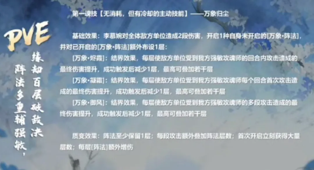 接着PVE方面的1技能是可以通过不断释放和积累3中结界的层数来提高我们主C的伤害,不过这个效果是需要不断释放技能后暖机才能叠到上限水准的,而且考虑到主C在触发这些结界效果后是会减少结界层数的,所以李慕婉应该在战斗中也需要不断释放技能来补充结界层数才行。