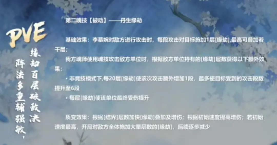 然后是PVE方面的核心被动,这个被动可以通过不断叠加“缘劫”状态的层数来提升我方的伤害,核心包括可以提升我方主C的伤害段数等等效果,且这个被动在李慕婉初始速度达到最高时可以开场便触发释放,因此李慕婉于PVE短图中也是可以有不错的爆发增伤能力的。