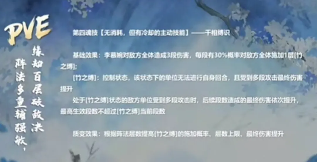 最后PVE方面的4技能则是通过“竹之缚”状态来控制对方,而被施加这个状态的敌人也会有更高的受到最终伤害提升效果。