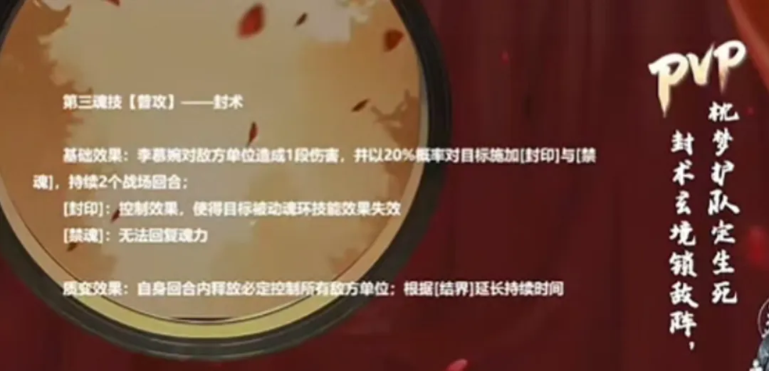 接着我们再来看PVP段李慕婉的特点,首先其PVP方面的普攻可以概率使敌方的被动魂环失效,以及无法回复魂力,不过这两个效果就算是必定释放在80级以上时应该也无法直接突破意志值的保护。