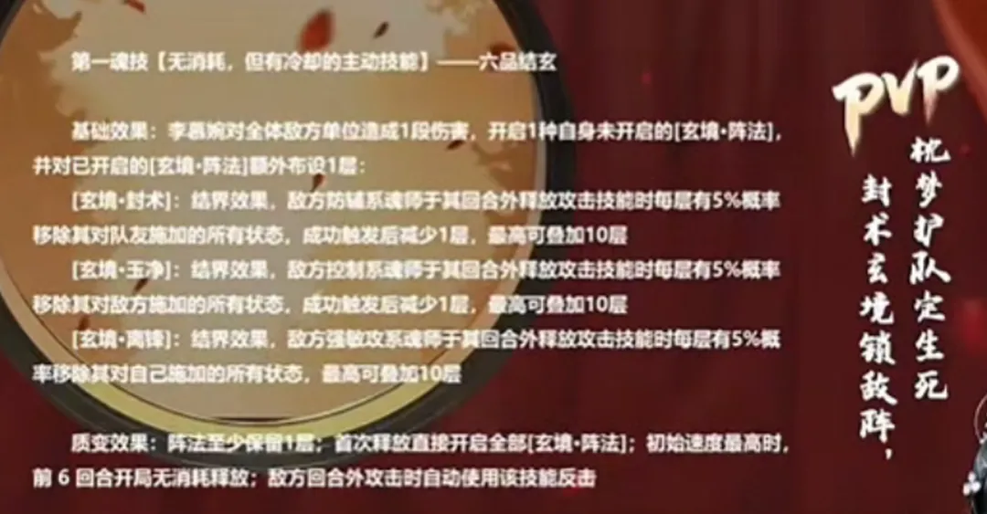 然后其在PVP种的1技能,依然时三种结界,但其结界的效果却变为了对敌人不同类别魂师的全面限制,并且李慕婉在速度最高时还能于战斗前6回合自动无消耗释放这个技能......且敌方回合外攻击时也会自动释放这个技能......有点高频了对吧。
