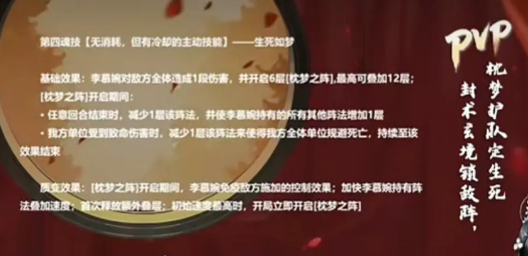 最后的4技能则可以通过开启“枕梦之阵”来辅助全队队友,例如可以保护我方角色不死等等......