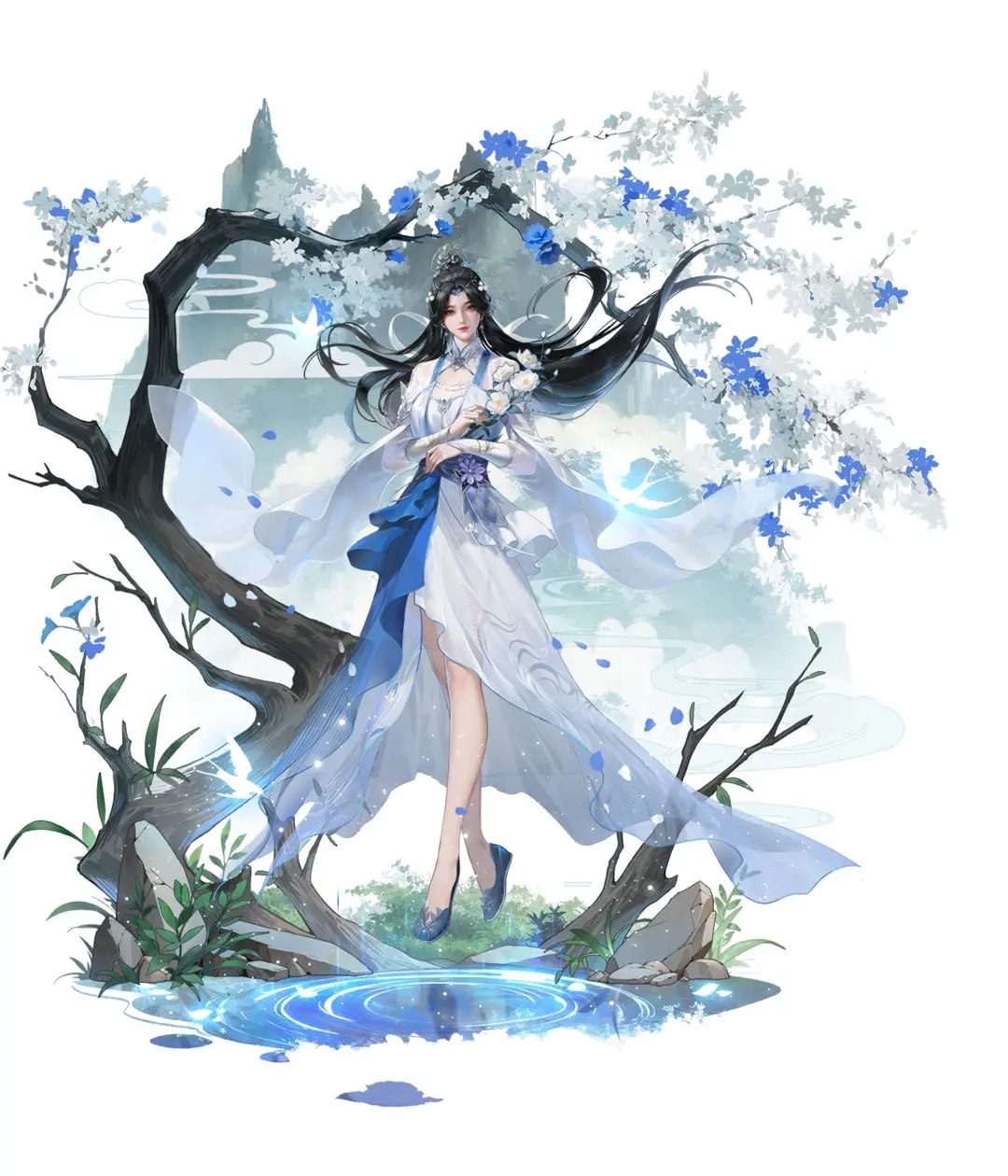 蓝白相间的衣袍,轻纱如雾
