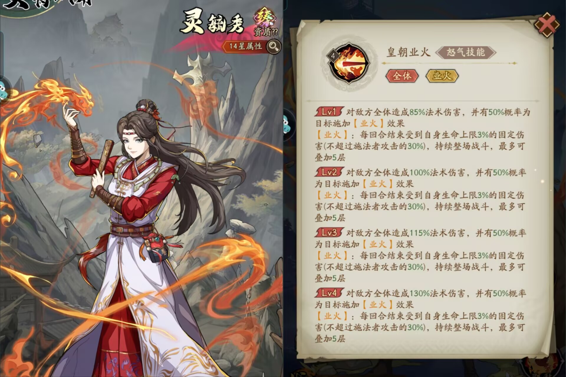 灵技低的灵毓秀完全用不了,表现在就是业火叠的慢导致出伤慢,完全打不出伤害。当灵技达到6级和7级的时候,这时候业火叠的效率提升,并且业火无法在被驱散和抵消。