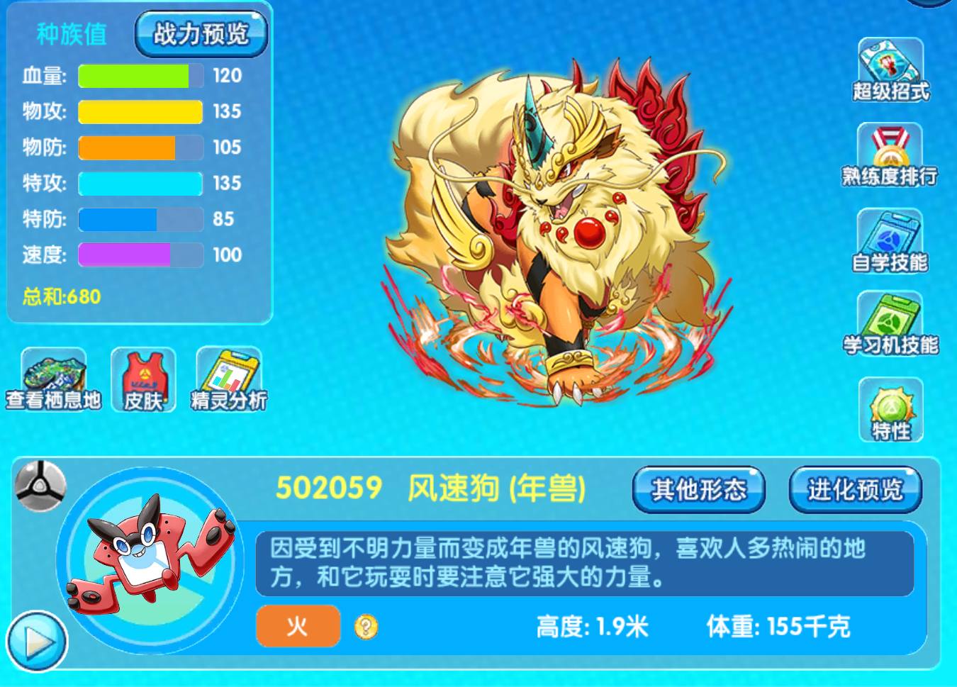 但是对于风速狗来说,在当时能够回血,可以说是非常的给力了,为什么?到后来我们可以发现风速狗其实出场率很低的,因为风速狗当时登场的时候赶上了一个,对于整个游戏来说非常大的改革点,这个改革点不是别的,就是努力系统增加了,我们可以观察一下风速狗的种族值,很明显这是一个双刀流的宠物,那么努力值得到来双刀宠物,已经完全被淘汰了,所以说年兽风速狗的处境才一点一点下降了。
