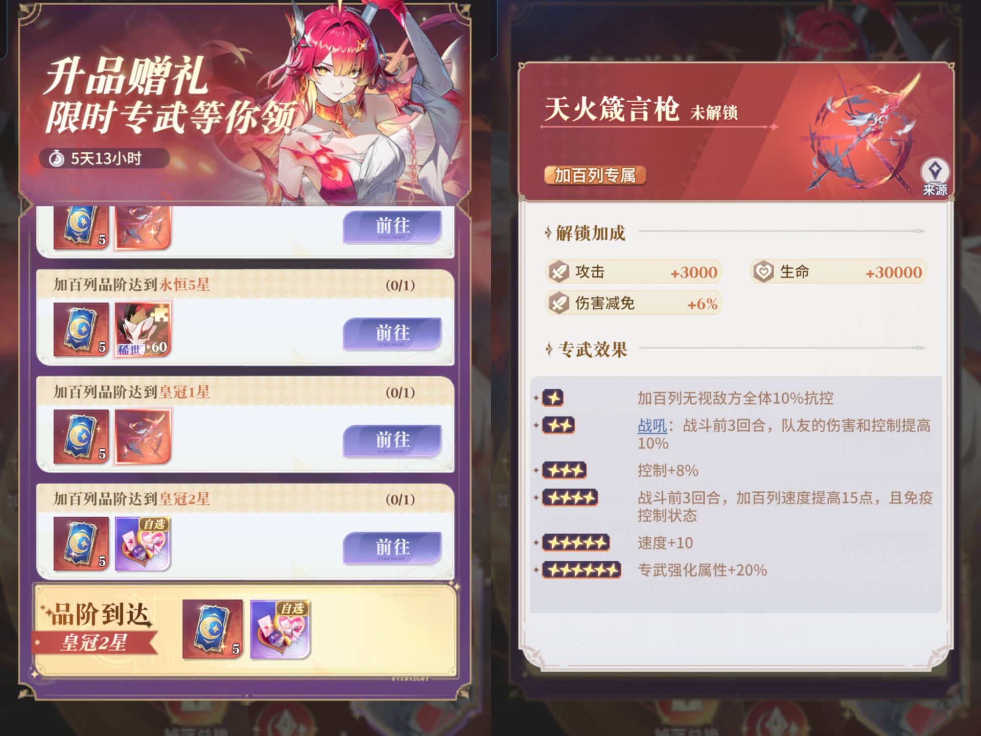 ②另外皇冠1星在活动【升星增礼】中可以获得2把专武!最大化的拿下活动给的奖励。