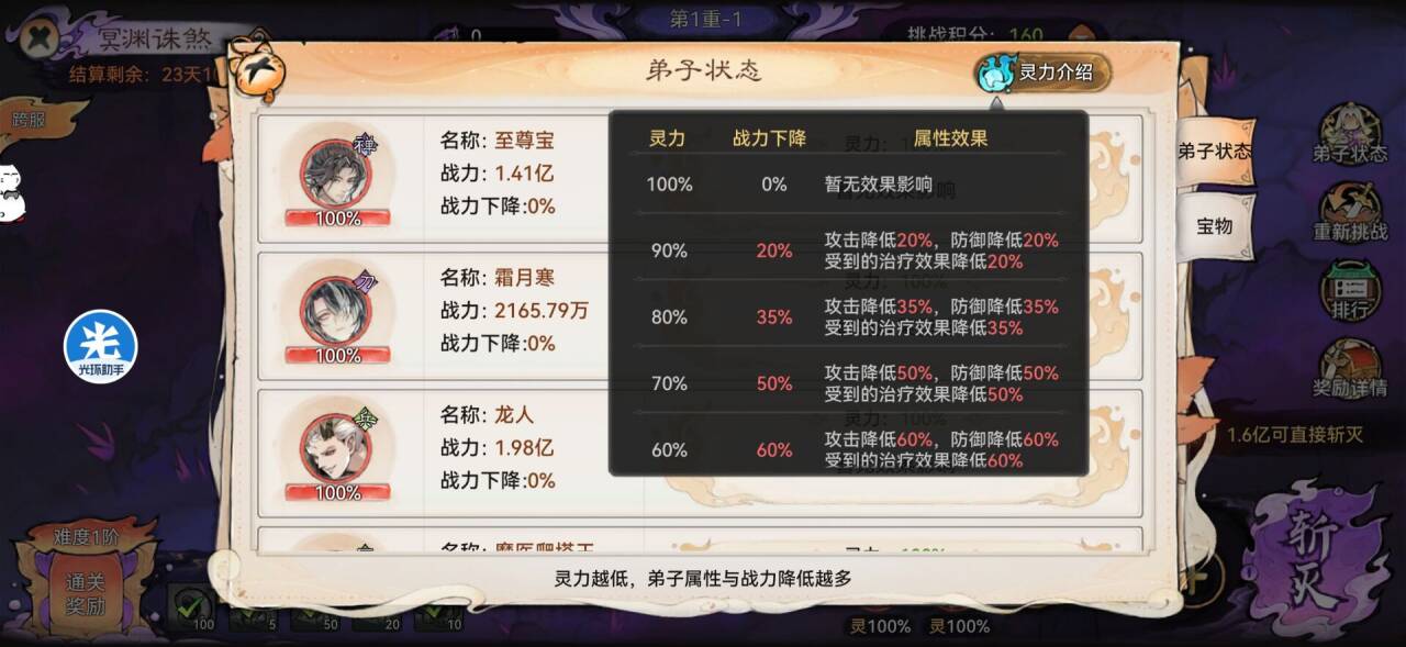 这样灵气每下降10%都会大幅度降低战力,开局你无脑上5名弟子消耗灵气,只会影响你后续通关。