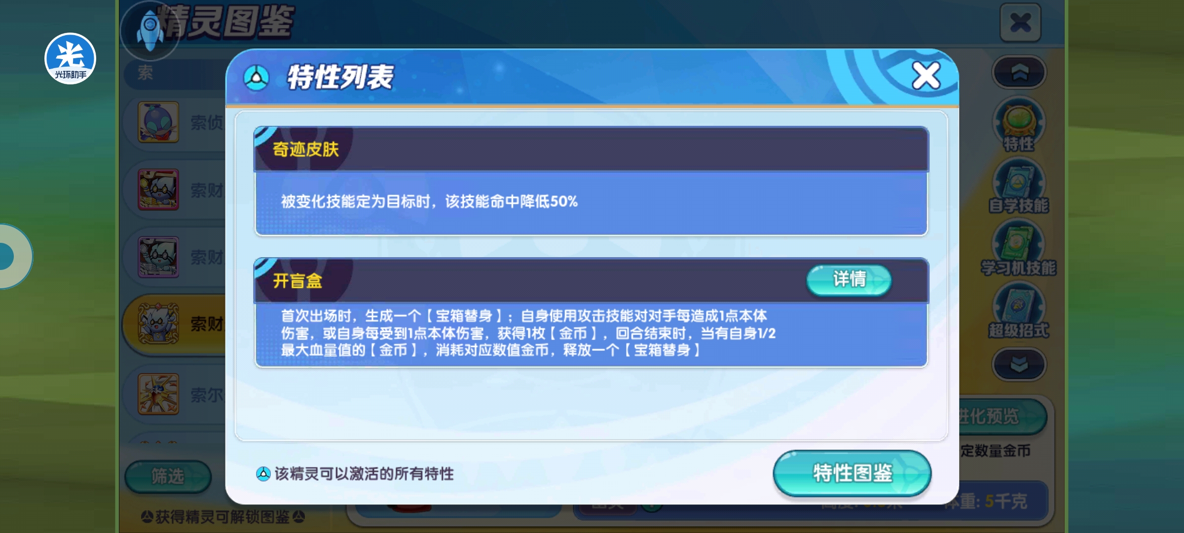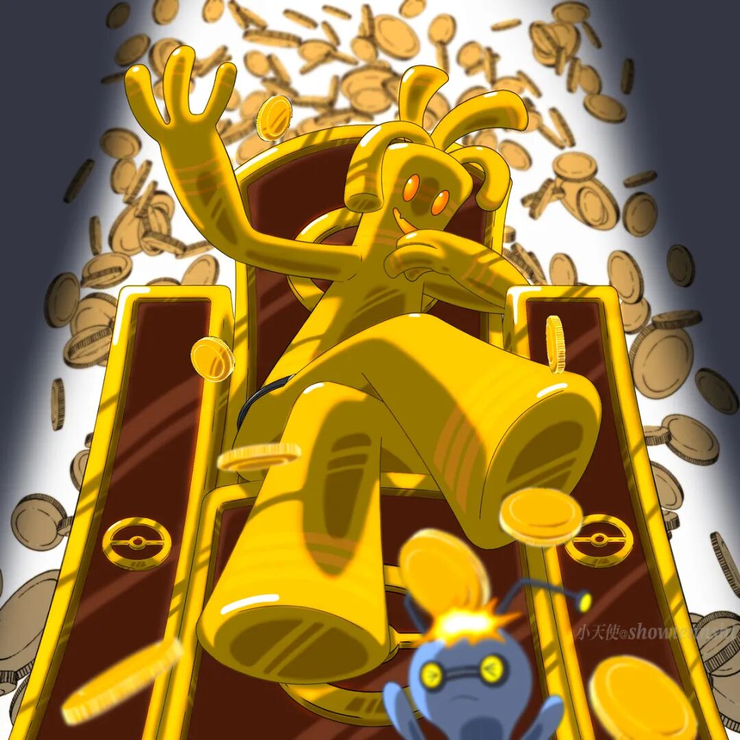 首次出场时,生成一个宝箱替身;自身使用攻击技能对对手每造成点本体伤害,或自身每受到点本体伤害,获得1枚金币,回合结束时,当有自身1/2最大血量值的金币,消耗对应数值金币,释放一个宝箱替身,当宝箱替身被打破时,随机触发以下效果,对手损失1/3最大血量,对手物攻、特攻、防御、特防、速度能力等级-1,自身回复1/3最大血量,自身物攻、特攻、防御、特防、速度能力等级+3,自身处于替身类状态下,不会进入宝箱替身状态;宝箱替身状态下,使用替身类技能失败,不会被特性、技能无视、改变、复制。