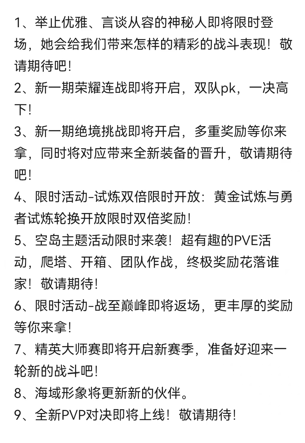 第五是有个新的PVE玩法,目前测试有点类似周年庆的凯多挑战,不过后面应该还会有调整,具体等官方上线为准!