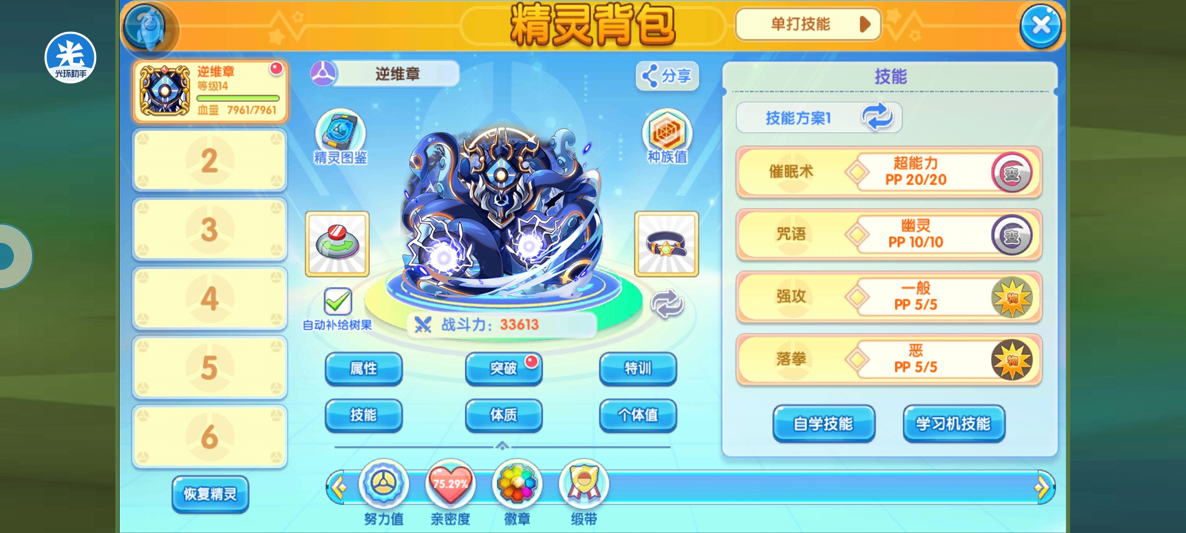 辅助向的逆纬章选择的技能很多,除了咒语这类逼退的,还有猛毒、寒冰上状态的,其他属性实用性比较强的是催眠术,打控制,吼叫逼退这两个为主,虽然说它的发挥面比较一般,但是有特性的加成,因此落拳基本是必带的。而且还有水泡防御,可以给打一下后跑了,这样更容易让骗术出现,不过太脆还有时候没机会放,不过它的技能需要学习机,这个就看各自能力了,总之,高配低配都可以玩,毕竟用个特性。