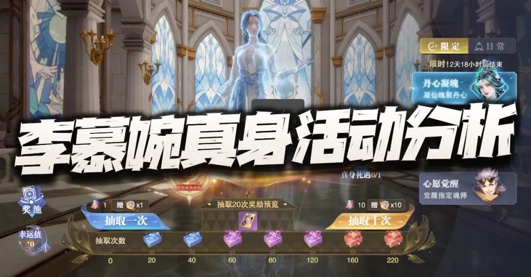首先此次活动会带有“星辰魔猰”和“惑幻离魂鸩”这两个凶兽魂环的自选,而这俩嘛也是咱们游戏的老演员了,部份朋友在之前就已经给提升到80万年,甚至都100万年了,所以这波就属于还没有升满的朋友可以适当补一补的节奏。此外这俩凶兽魂环合成后的“惑幻魔猰”一般是给目前长图中的SP白沉香佩戴,其也刚好对应了此次活动顺带有SP白沉香特殊丹方上线的安排,而这个合成凶兽魂环可以施加的“星辰璃光”buff的增伤效果非常夸张,不过其不足就是一场战斗很难能累满......然后这个活动的80抽累抽奖励中,可自选的魂导器......又是“凋零”版本的银月神光罩,这点大家需要注意......然后160抽的累抽奖励为SP白沉香的特殊丹方,这个丹方更多是提升我方长图增伤的辅助效果,考虑到SP白沉香目前的地位和价值,其获取的优先级也要远远高于之前上线的徐三石、唐雅等角色的特殊丹方。然后在本次活动的保底抽取奖励中,除了依然是80抽保底一次的SP李慕婉真身碎片外,比较核心的奖励就要数361抽才能保底获取的李慕婉躯干进化魂骨了,这个进化魂骨除了基础的增伤效果外,在PVP中会有一定的先手反制效果,不过鉴于目前李慕婉的三个结界限制能力也不能达到绝对的天花板级别,所以整体上其后续的PVP强度还得观察观察。哦对了,李慕婉的真身达到彩色5星还能领到阔别依旧的SP阿银源魂心,作为当前版本最为重要的几个源魂心之一,SP阿银的源魂心就直接意味着我们的SP阿银会不会面临下课的处境......不过其获取成本也较为夸张,彩色5星的逻辑就是需要把池子里的共计6个真身碎片全部抽完,这里最多就需要486抽才能保底......获取,而且还得把兑换商城中的真身碎片给兑换完才行。接着此次活动的抽数来源分别有: