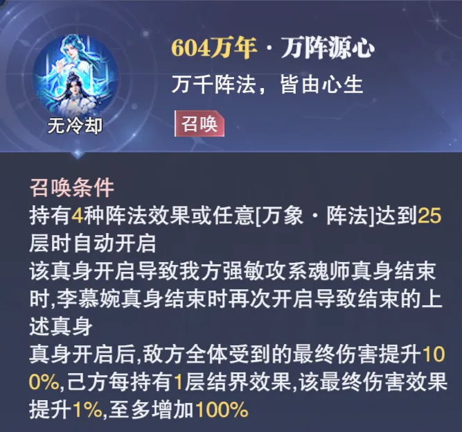 首先李慕婉真身的召唤条件为持有4种阵法或任意阵法打到25层时即可自动开启,考虑到李慕婉在战斗中一般处于一速的位置,所以其真身触发的时机一般不会和SP+尘心等主C的真身产生冲突,甚至她放真身的速度可能都要比雪帝快多了......