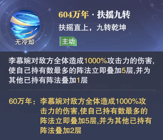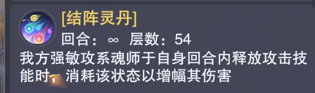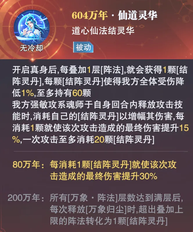 最后的真身光环效果则是通过我们叠加不同阵法的层数,来使自身获得“结阵灵丹”,这个灵丹可以在主C释放技能时进行消耗并提升主C的输出伤害,当然其中也有每次伤害提升的次数伤害,且到了彩色5星后其还会加快这个丹药移除的暖机效率,整体而言对于长图的增伤是有很大意义的。