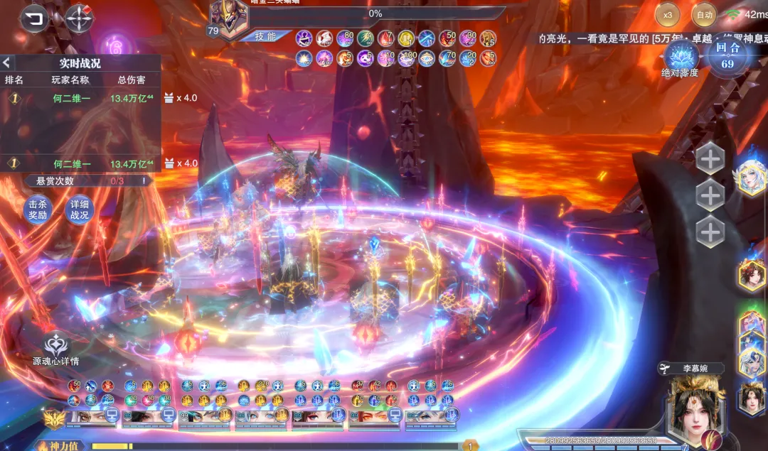 而当我们在完全没有激活真身的前提下,此时我们打世界悬赏的敏攻系5桩boss,此长图阵容的大致伤害能达到约100亿⁴³-1000亿⁴³左右,这个数据大家可以先行参考一下。